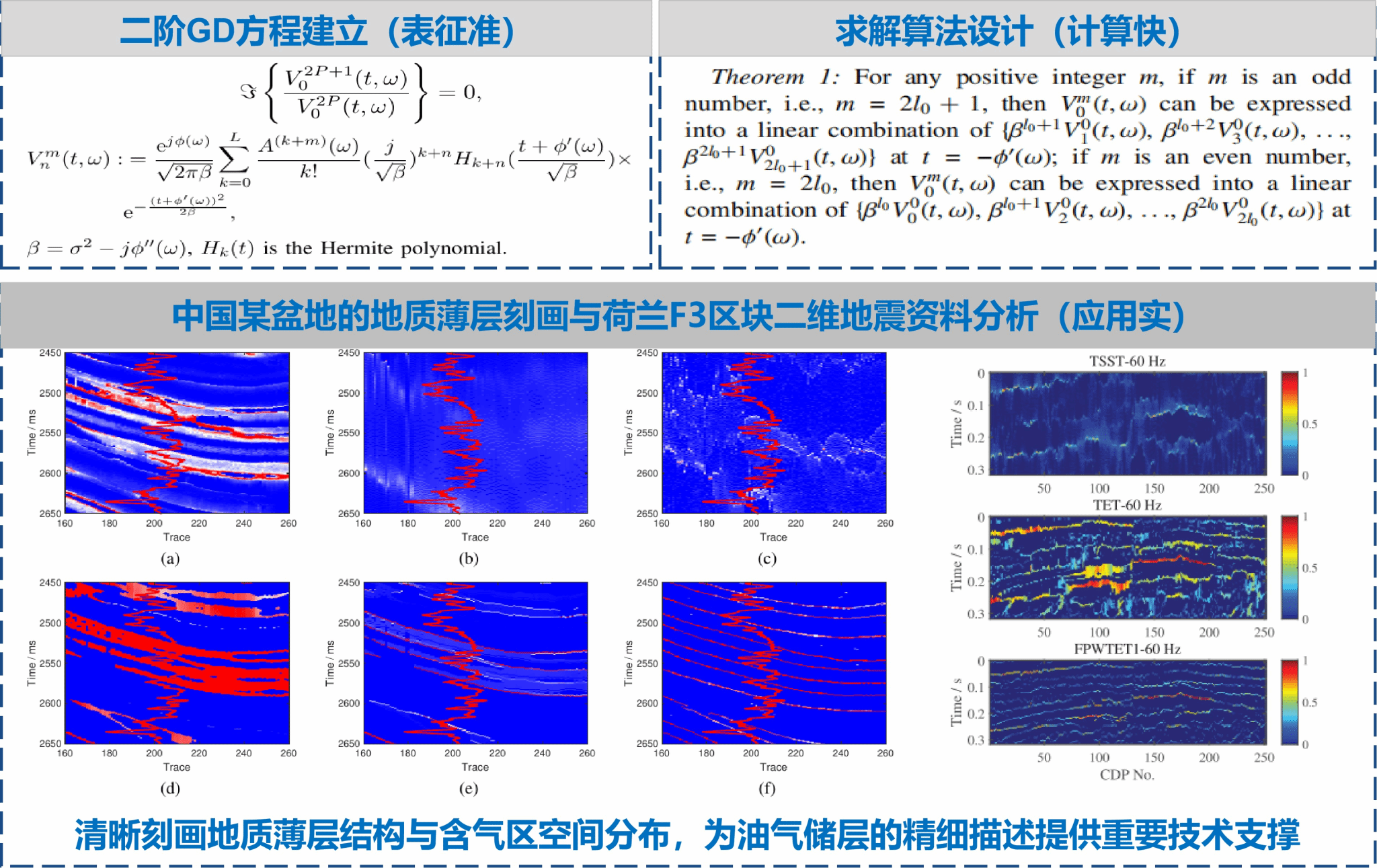 研究介绍:现有时频分析方法在处理地震强幅度调制脉冲信号时,常面临能量扩散、群延迟定位不准及抗干扰能力弱等挑战。为此,本文定义了群延迟方程这一新型特征表示算子,并从理论上推导了N阶振幅调制信号的二阶GD方程,为强幅度调制信号提供了新的特征表示形式;进而证明了二阶GD方程可由不同窗函数的短时傅里叶变换等价表示,据此设计了方程的快速求解算法并分析了算法的收敛性。基于上述理论,通过关联时频点并增强鲁棒时频点的作用,提出了固定点加权瞬态提取变换(FPWTET)方法。理论上,本文构建了以GD方程为核心的时频后处理框架,揭示了瞬态提取变换、时间重排多次同步压缩变换等经典方法均为本框架的特例,从而统一并深化了相关方法的理论基础。在实际应用方面,将FPWTET方法成功应用于地质薄层识别与低频阴影属性分析,结果表明该方法能清晰地刻画地质薄层结构及含气区空间分布,为油气储层精细描述提供了有效的技术支撑。