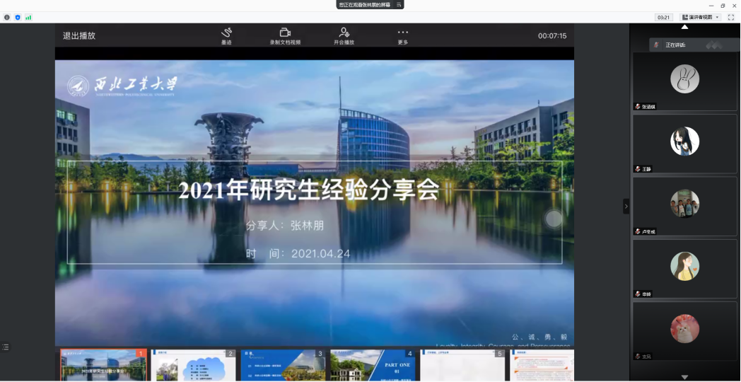 2021年4月23日,韩国av 举行了2021届研究生优秀毕业生线上分享会,2021届优秀毕业生闫璐瑶、张林朋和卢冬成三位毕业生围绕他们在校期间的生活、科研、工作等方面,为学弟学妹们分享经验。