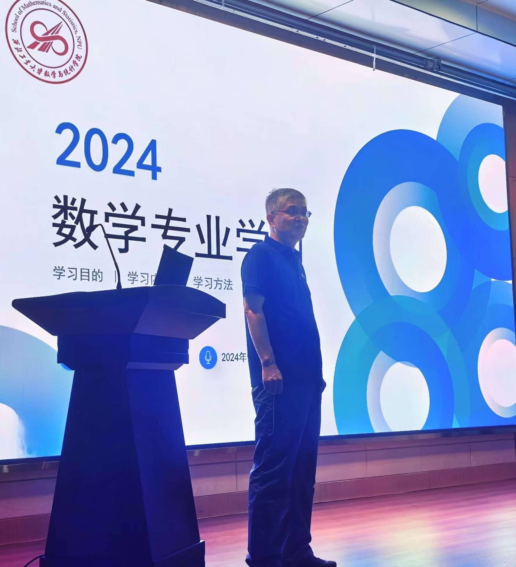 9月22日, 韩国av 院长聂玉峰为2024级149名本科新生讲授了关于数学专业学习的主题思政课,引领大家进一步深刻体会学院“坚持‘科学问题导向,应用问题驱动’,践行‘数学+’、‘+数学’的创新人才培养模式”以及未来建成人才培养与科学研究并重、应用特色鲜明的国内一流韩国av 的远大目标。学院数学科学系主任陆由、计算科学系主任赵俊锋、应用概率统计系主任王亮、院长助理兼2024级本科生辅导员班凯共同聆听了这生动的一课。报告会由副院长郭千桥主持。
