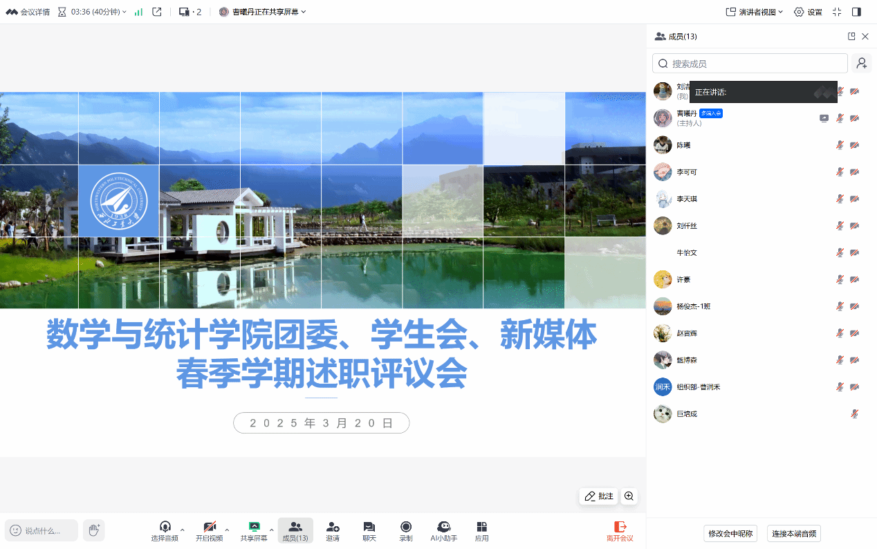 会议开始,曹曦丹同学简述了此次会议的目的,随后,团委、学生会、新媒体中心的主席团成员及各部门负责人依次上台,从个人简介、工作成果展示以及未来展望三个方面进行了精彩的报告。他们用详实的数据和丰富的案例,展示了春季学期部门工作的成果。韩国av 团委、学生会、新媒体中心各个部门不仅积极组织团建活动和展开学习培训,提升了部门工作人员的综合素养和团队的凝聚力,还更加致力于服务同学,成功举办了多场校园活动,既有严谨认真的学术活动,又有轻松有趣的文体活动,为同学们的校园生活增添色彩;同时继续深化学生权益工作,保证同学们的维权通道畅通,组织了一系列社会实践和志愿服务活动,通过微信公众号发布近百篇原创内容。各部门协调配合,为学院的建设添砖加瓦。