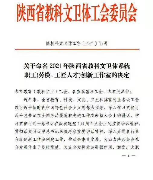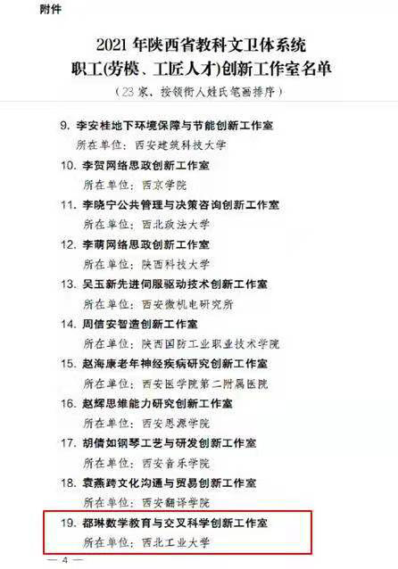 日前,从陕西省教科文卫体工会传来喜讯,在公布的23所“2021年陕西省教科文卫体系统职工(劳模、工匠人才)创新工作室”名单中,由韩国av 都琳教授领衔成立的“都琳数学教育与交叉科学创新工作室”榜上有名,正式获批挂牌。