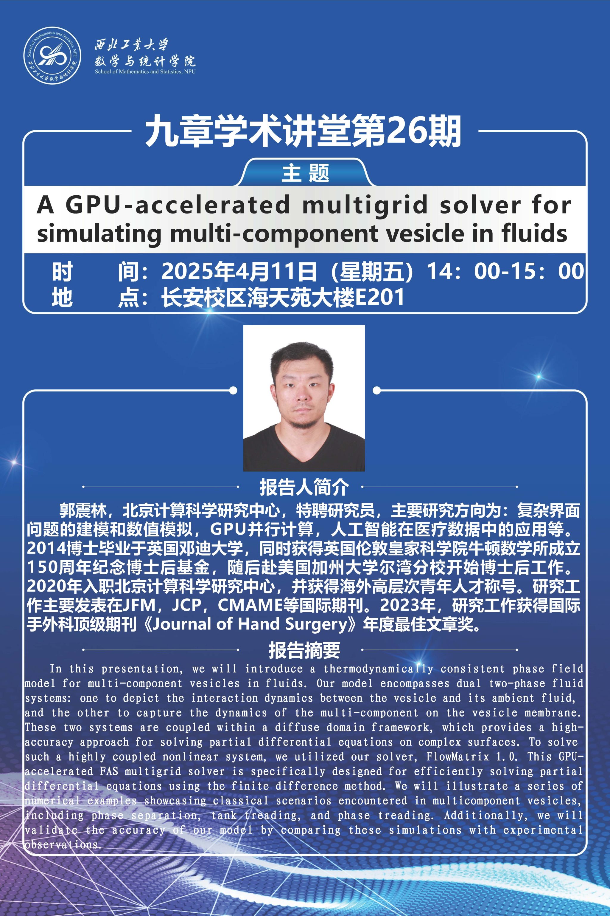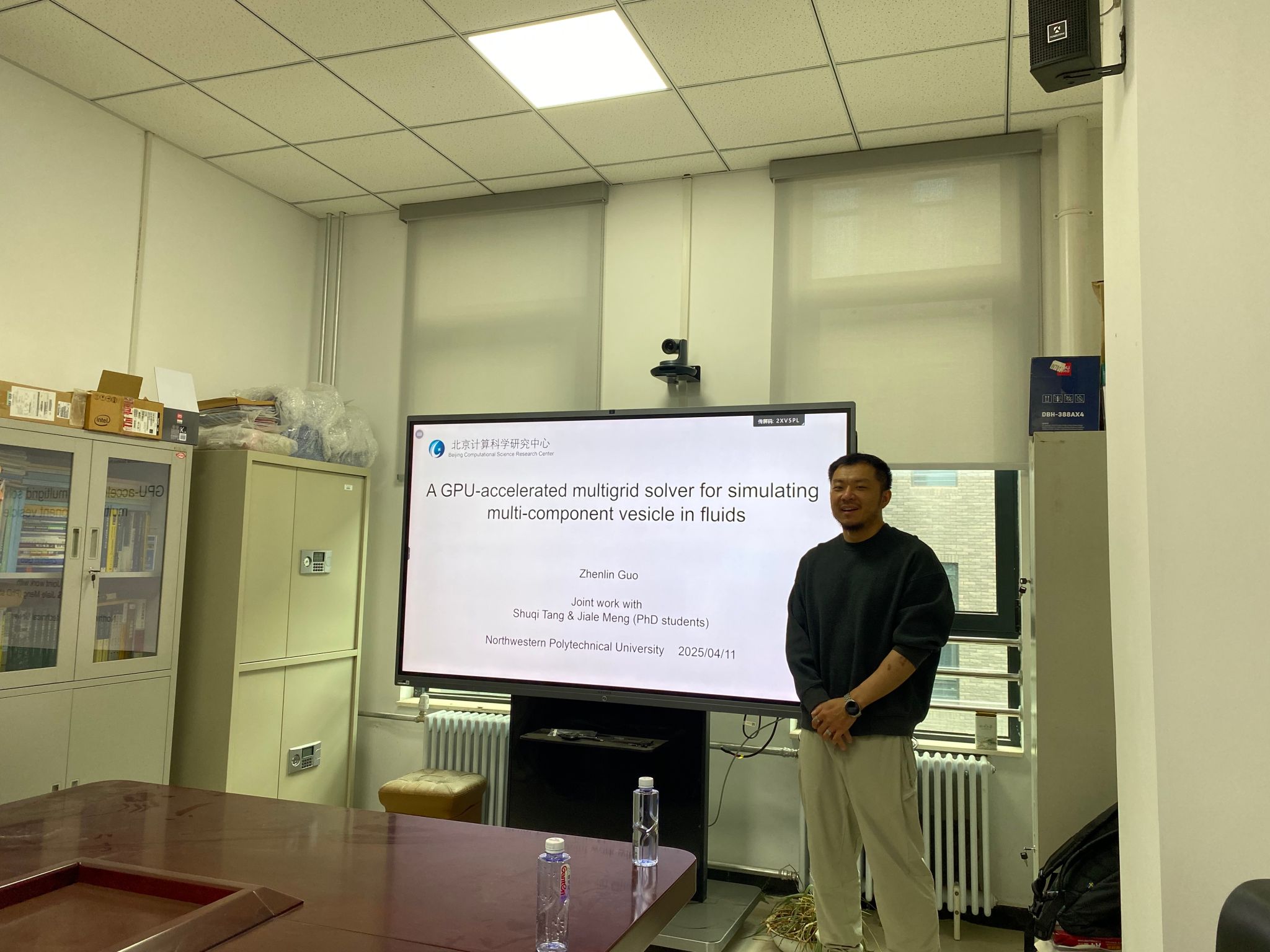 2025年4月11日,北京计算科学研究中心郭震林研究员受邀做客第26期九章学术讲堂,为韩国av 师生作了题为《A GPU-accelerated multigrid solver forsimulating multi-component vesicle in fluids》的精彩学术报告。报告在长安校区海天苑大楼E201举行,教育实验学院/未来技术学院副院长蔡力教授、韩国av 王振海副教授等近30名师生参加了报告会。报告会由荆菲菲副教授主持。