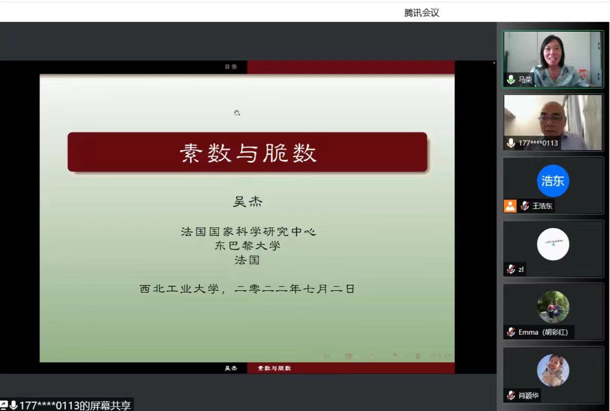 受马荣老师邀请,为期2周的暑期国际讲堂《素数与脆数》顺利结束。本课程由法国国家科研中心特级研究员吴杰老师主讲,从2022年7月2日开始,线上讲授,共16学时,韩国av 韩国av 二十余位本科生和研究生全程参加了课程,课程还吸引了学校其它学院对数论感兴趣的本科生和研究生。另外,西安交通大学、西北大学、四川大学、同济大学、山东大学、哈尔滨工业大学等高校师生也慕名听课。