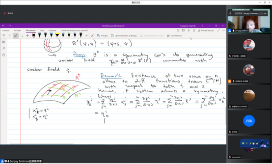 2022年6月27日至7月9日,韩国av 举办的暑期国际讲堂《李代数与可积双曲方程》通过腾讯会议APP圆满完成授课。该课程由莫斯科国立大学教授Dmitry V Millionshchikov(Millionshchikov是代数拓扑学及其应用、微分几何和幂零李代数理论及其应用等领域的知名专家。他还是莫斯科国立大学罗蒙诺索夫分校高等几何学和拓扑学系的副主任)和Sergey V. Smirnov(Smirnov曾多次在北京大学,密歇根州立大学,莫斯科独立大学做讲座)讲授。来自数学、机电及伦敦玛丽女王等学院的本科生、博士生及旁听生参加了该课程。