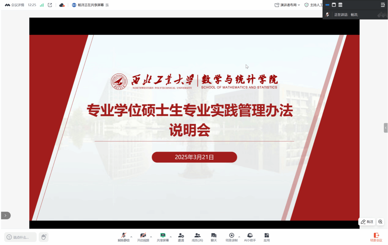 会上,研究生教学秘书杨洋围绕学术规范、实践形式与要求、校外实践安全规范及考核标准等关键环节系统解读了学院《专业学位硕士研究生实践管理办法》。