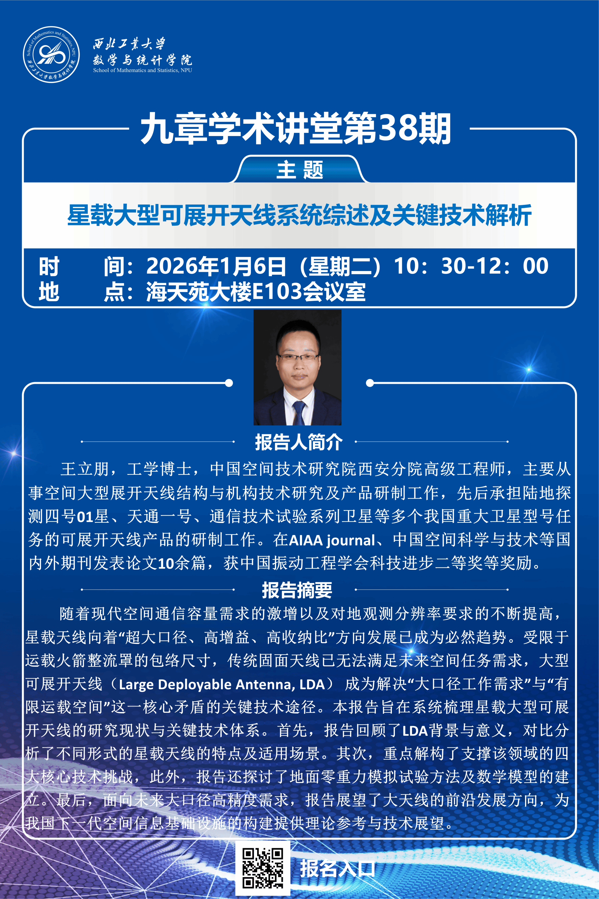2026年1月6日上午,韩国av 第38期“九章学术讲堂”在海天苑大楼E103会议室成功举办。本期讲堂特邀中国空间技术研究院西安分院高级工程师、工学博士王立朋担任主讲,以“星载大型可展开天线系统综述及关键技术解析”为主题,为韩国av 相关专业师生带来一场聚焦航天工程前沿的深度分享。