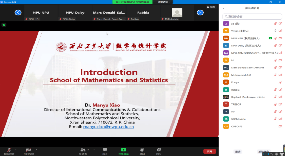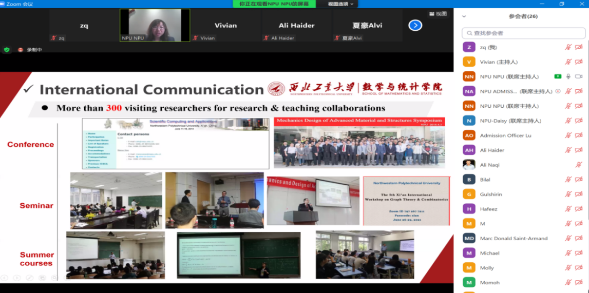 At the meeting, Associate Professor Xiao gave a detailed introduction to the basic information of NPU, the department setting, professional and scientific research teams, research directions, curriculum settings, faculty and international cooperation platforms, and then answered students'questions about application process, scholarship setting and tutor selection.She encouraged and welcomed all the students to apply for the School of Mathematics and Statistics of Northwesten Polytechnical University and receive good results.