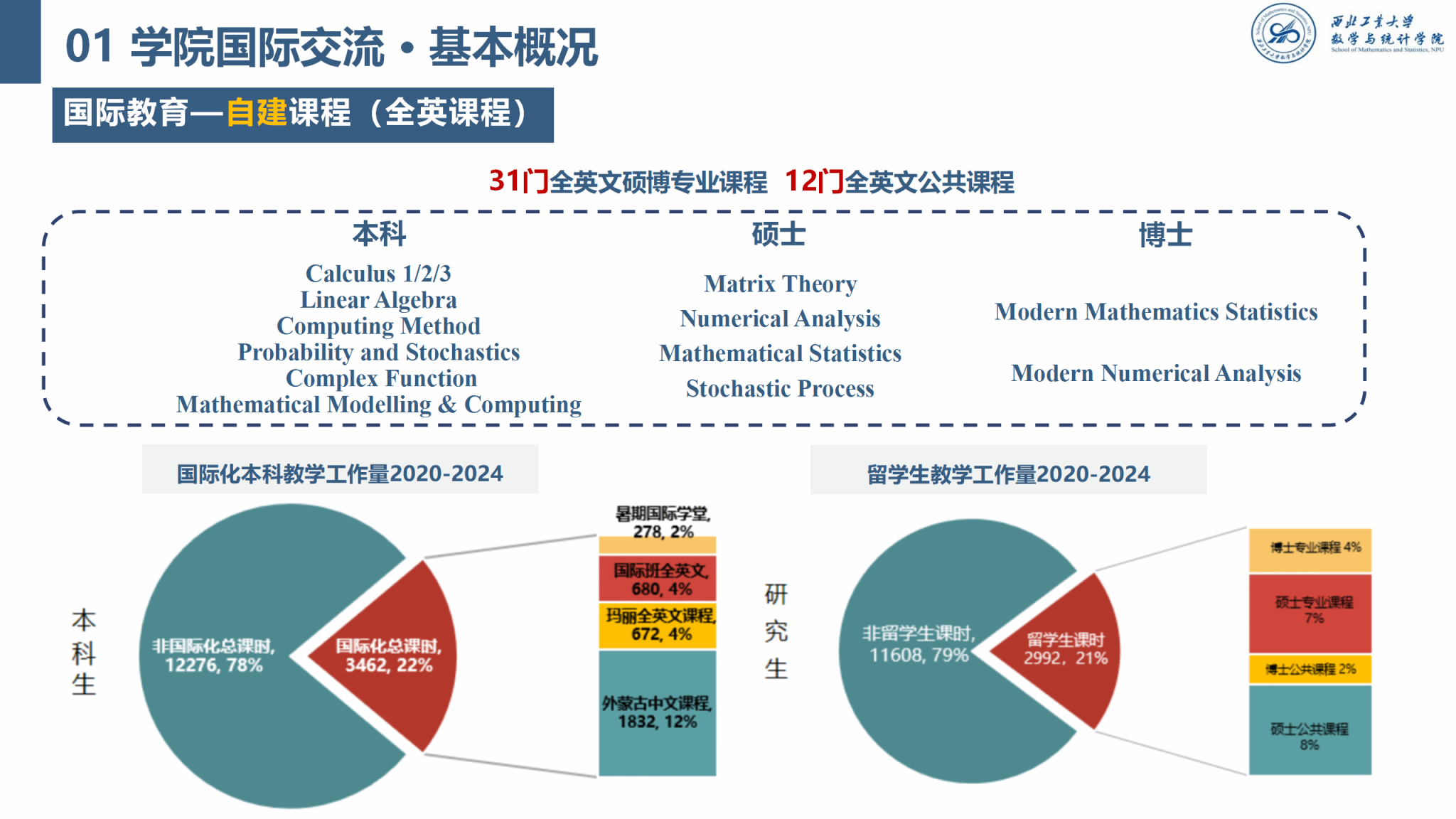 早在2011年我校启动“探索国际化人才培养模式”的国家级教育改革试点项目,创建中外学生同堂授课、同卷考试、同室科研、同班活动的本硕博贯通培养国际化人才本土教育模式的“国际班”。作为承担我校公共基础数学课程的数学与统计学院,相继开设了《微积分》、《线性代数》、《概率论与数理统计》、《复变函数与积分变换》、《计算方法》等5门英文课程。2016 年西北工业大学伦敦玛丽女王大学工程学院获教育部正式批准,成为我国西北地区一所中外合作办学机构,我院承担了该联合学院《微积分》、《线性代数》、《数学建模与计算》三门全英文课程的教学。