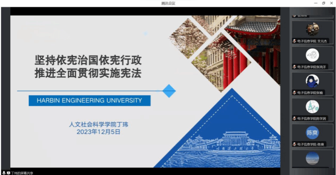 为深入学习贯彻习近平法治思想,大力弘扬宪法精神,进一步增强广大师生的宪法意识和法治素养,12月5日,数学与统计学院、电子信息学院联合开展普法宣传教育活动,特邀哈尔滨工程大学人文社会科学学院丁玮教授通过线上形式讲授题为《坚持依宪治国依宪行政,推进全面贯彻实施宪法》的专题党课。数学与统计学院和电子信息学院理论学习中心组成员、师生党员代表共100人参加活动。党课由数学与统计学院党委书记王莉主持。