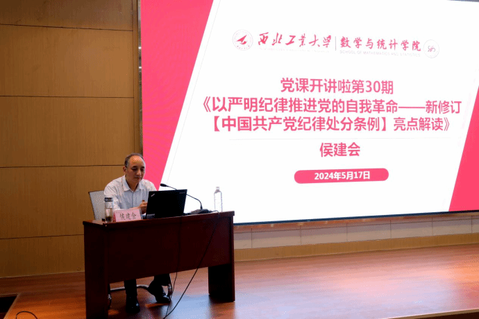 为扎实推进党纪学习教育,5月17日下午,数学与统计学院邀请中共陕西省委党校教授、中国科学社会主义学会理事侯建会开展专题党课,引导党员干部学纪、知纪、明纪、守纪。数学与统计学院师生党员100余人参加学习,专题党课由学院党委书记王莉主持。