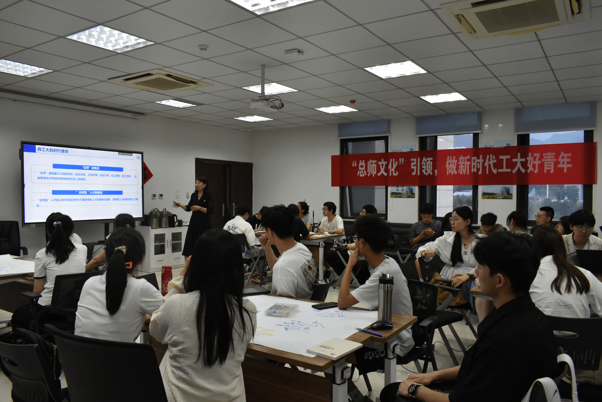 课程伊始,王莉老师通过翻转课堂引导学生加强团队协作,引导培训班成员短时间内迅速“破冰”的同时还向大家分享了自己在人工智能领域的见解与使用经验,带领同学们了解了“总师育人文化”、国防单位价值观以及红色精神与红色人物。