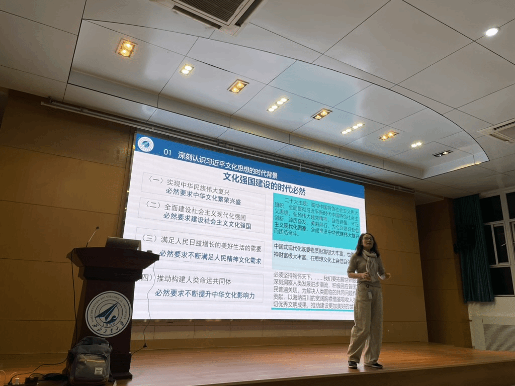 蒲瑶教授从世情、国情、党情多角度分析,引出文化建设的重要性,阐述了党在推动文化建设中所发挥的关键作用,并从多个维度详细解读了习近平文化思想的丰富内涵。她强调,当今国际局势复杂多变,文化在国家竞争力中的地位愈加凸显,作为新时代的青年,更要从思想深处理解所肩负的文化使命,积极拥抱习近平文化思想的指导。