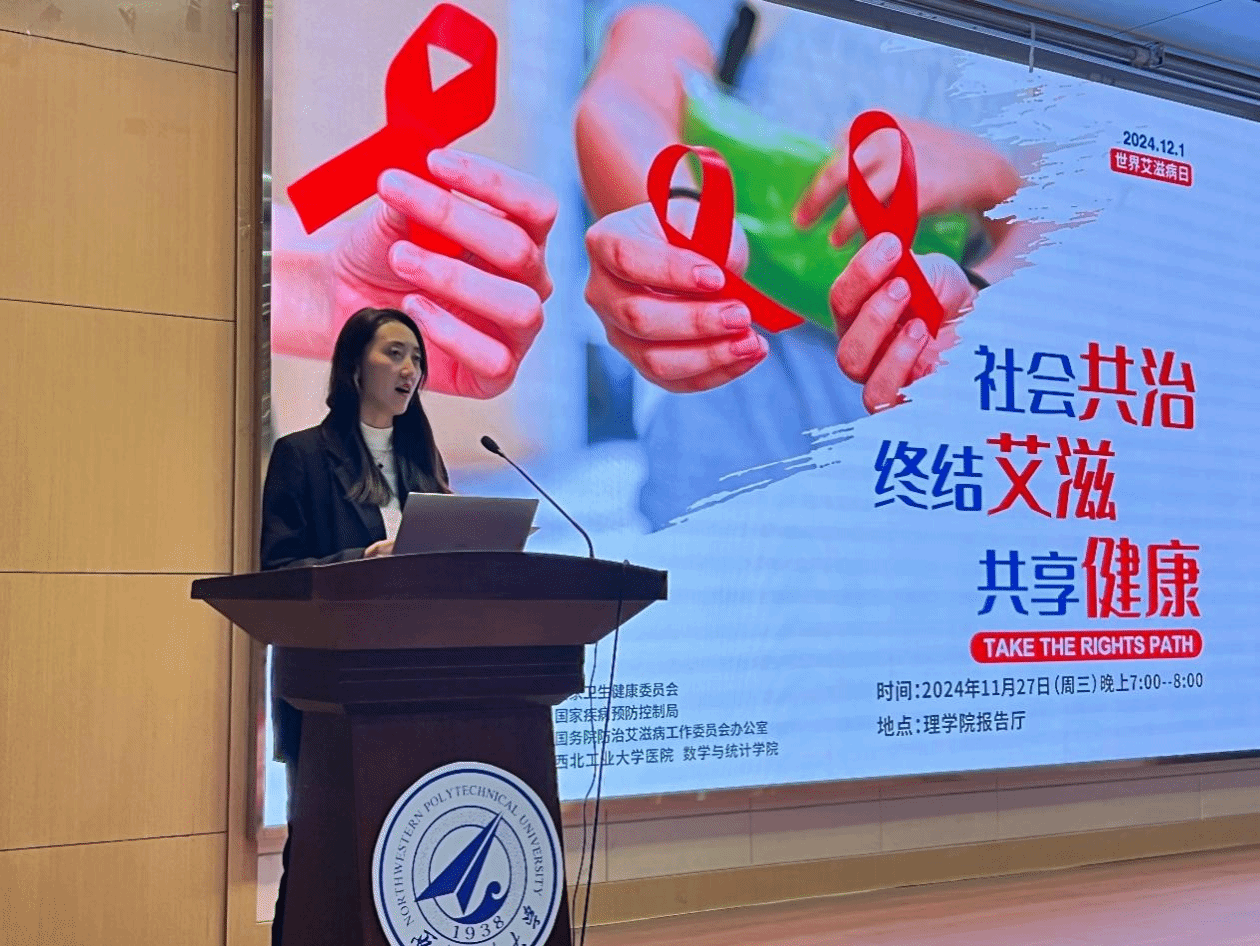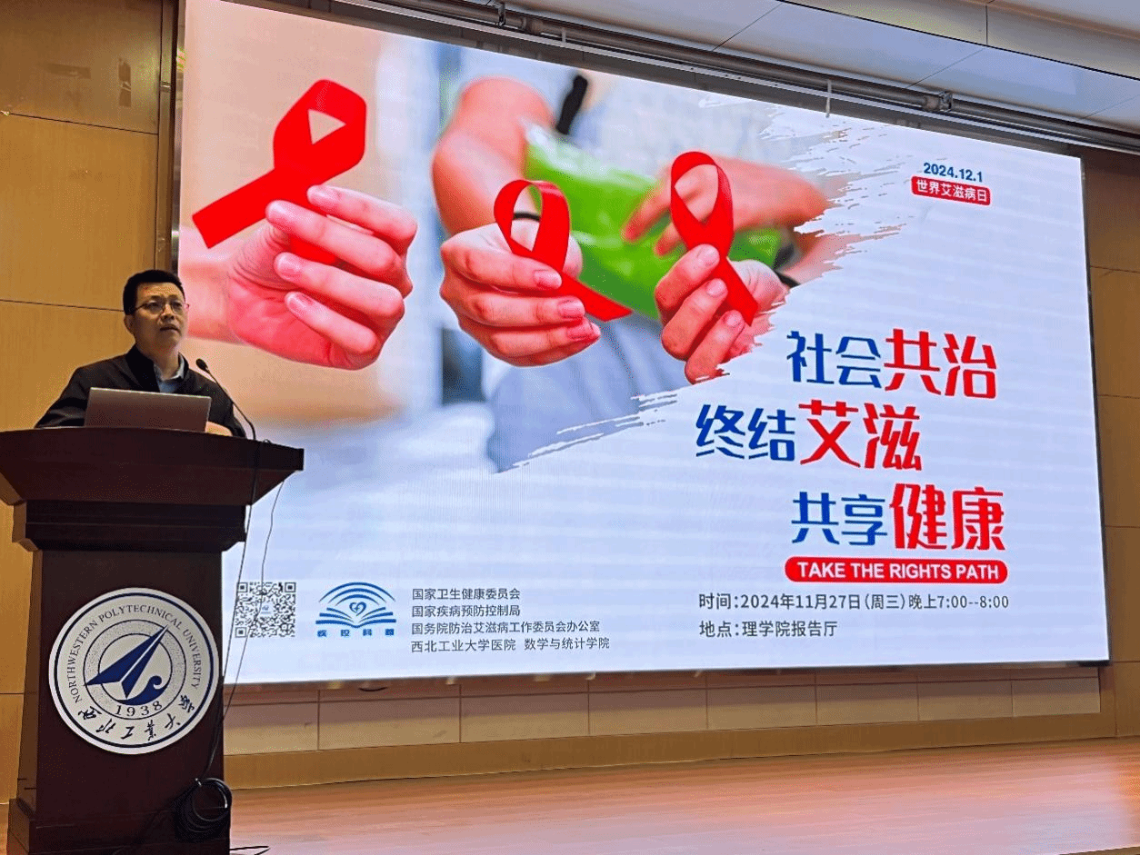 2024年12月1日是第37个“世界艾滋病日”,今年的宣传活动主题为“社会共治,终结艾滋,共享健康”(Take the rights path)。为积极响应国务院防治艾滋病工作委员会办公室提出的艾滋病防治宣传教育“进校园”口号,进一步做好校园艾滋病防控工作,提高广大师生的自我防范意识及保护能力,11月27日,校医院预防科联合数学与统计学院共同邀请市疾控专家开展艾滋病防治宣讲活动。西北工业大学医院副院长何凯亮、预防科徐欣雨医生、数学与统计学院责任医师周杨、数学与统计学院学工秘书曹立帆及学院60余名学生参与本次活动,活动由数学与统计学院党委副书记张莹主持。