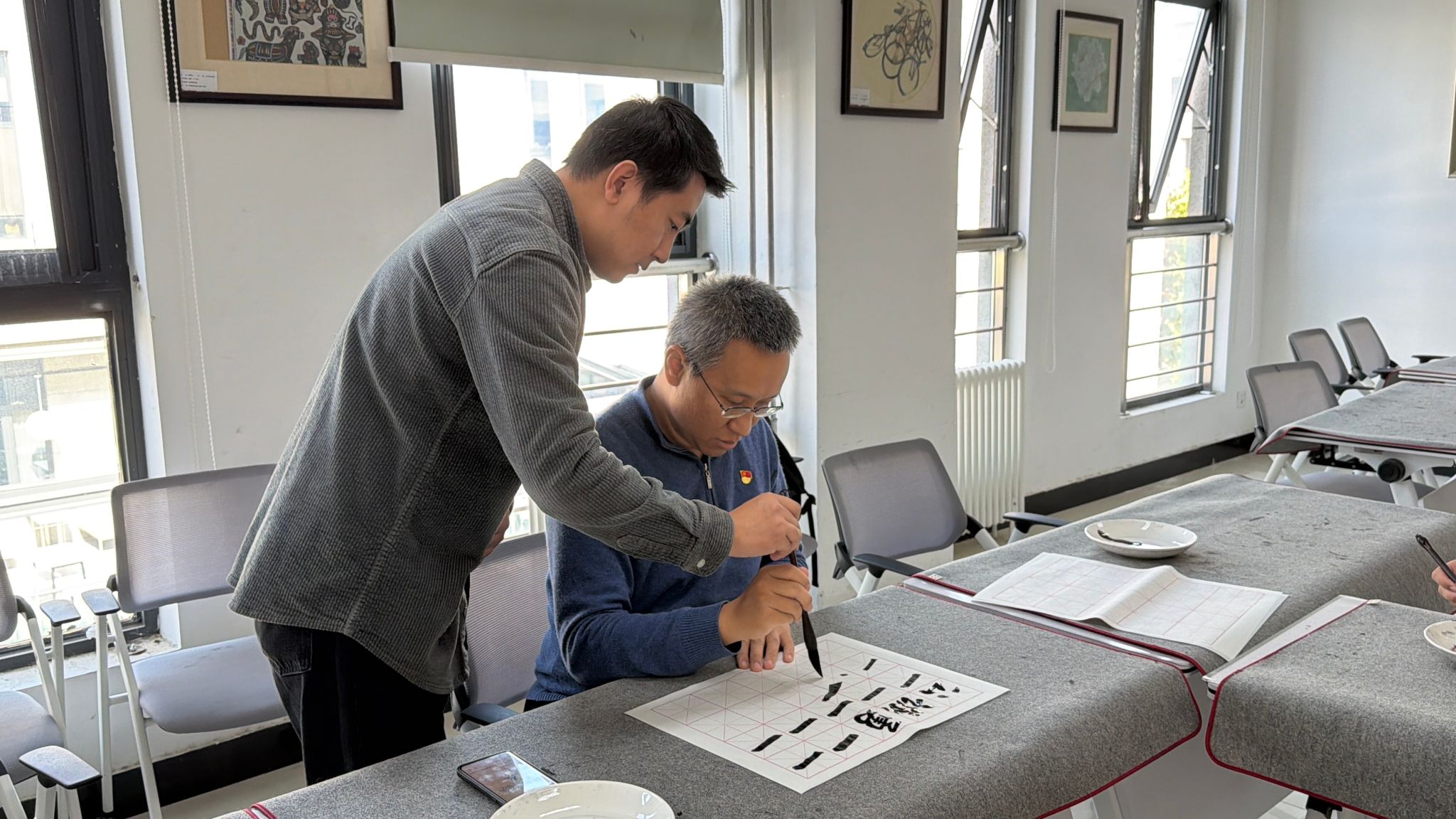 艺术教育中心特邀专业教师赵运全程指导。活动伊始,教师从汉字演变脉络讲起,细致拆解核心笔法,结合校训校风等关键词书写示范。现场案台宣纸铺展、笔墨齐备,党员们围坐观摩,在教师手把手指导下纠正握笔姿势,反复练习笔法技巧,墨香与交流声交织,氛围专注而热烈。