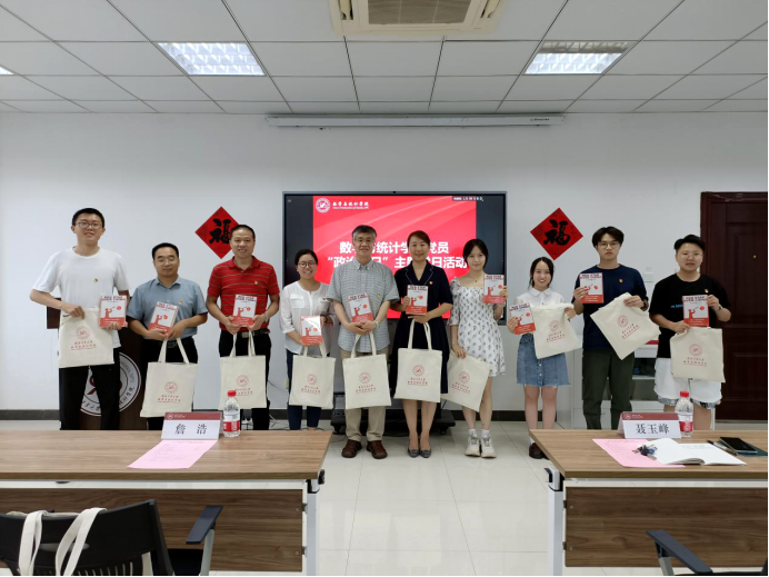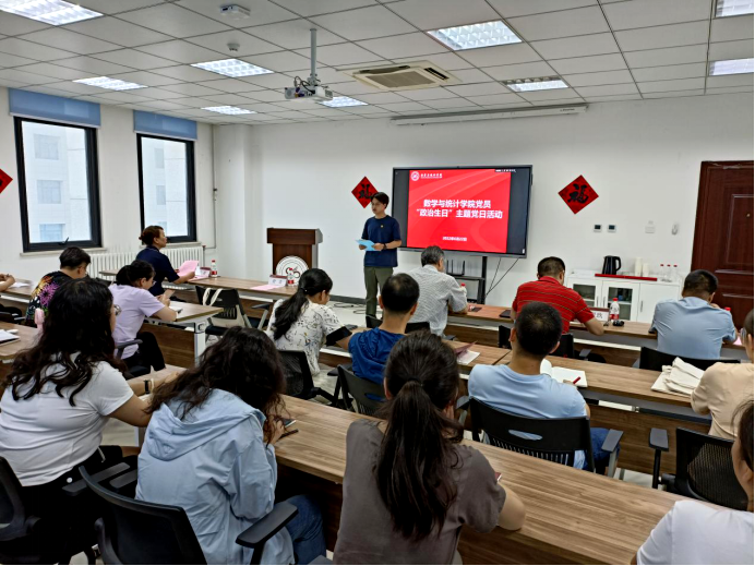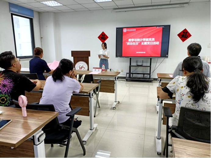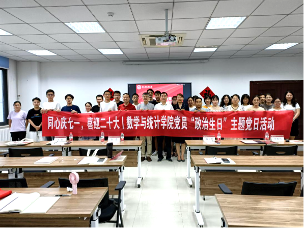 为庆祝中国共产党成立101周年,迎接党的二十大胜利召开,强化党员的宗旨意识、身份意识和责任意识,引导师生党员深刻感悟红色初心,汲取奋进力量,6月22日数学与统计学院开展党员“政治生日”主题党日活动,并由学校副校长詹浩同志为师生共上一堂专题党课。学院精心设计了“七个一”的“政治生日套餐”,即“送上一张生日贺卡、赠送一本红色书籍、重温一次入党誓词、再念一遍入党申请书、分享一段生日感言、观看一部微党课视频,共上一堂专题党课”,以庄重温情的政治仪式庆祝党员“政治生日”。学院党委书记王莉、院长聂玉峰、院领导班子成员、各党支部代表共36名党员同志共同参加了本次主题党日活动,活动由学院党委书记王莉主持。
