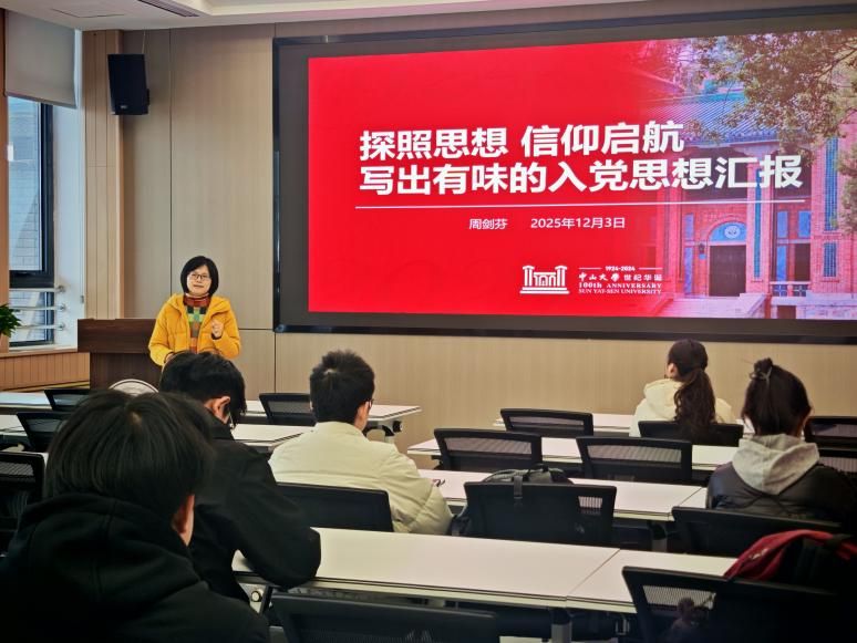 为严把党员发展质量关,引导发展对象端正入党动机、夯实思想根基,12月4日上午,数学与统计学院邀请中山大学数学学院(珠海)党委副书记周剑芬,为2025年秋季学期全体发展对象讲授专题党课。党课以“探照思想,信仰启航,写出有味的思想汇报”为主题,由专职辅导员张倩主持。