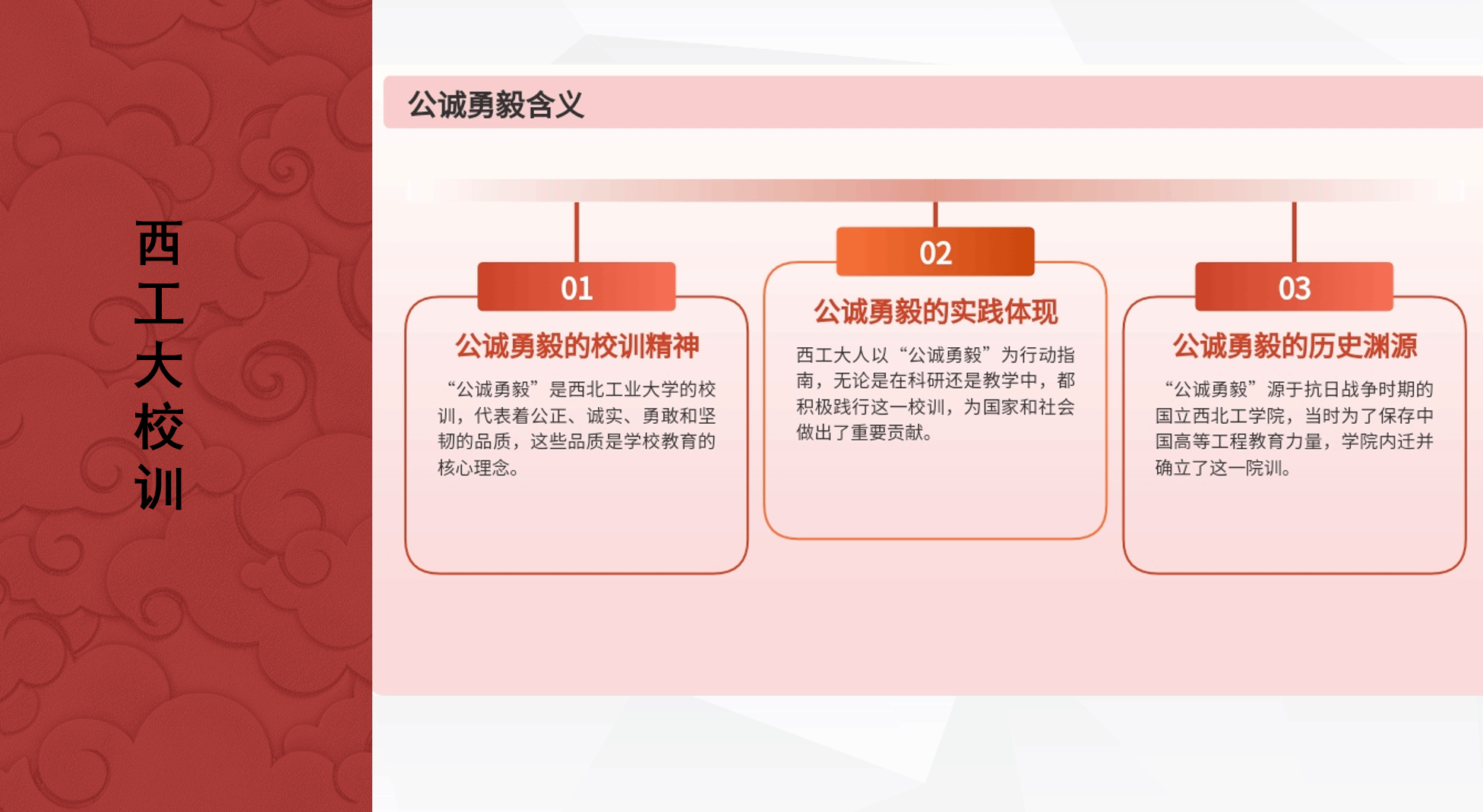 分享会首先解析了"公诚勇毅"校训的深层意蕴。1938年国立西北工学院成立之初确立的"公诚"精神,历经抗战烽火淬炼,在1957年西安航空学院与西北工学院合并组建西工大时,融入"勇毅"新内涵,形成完整校训体系。