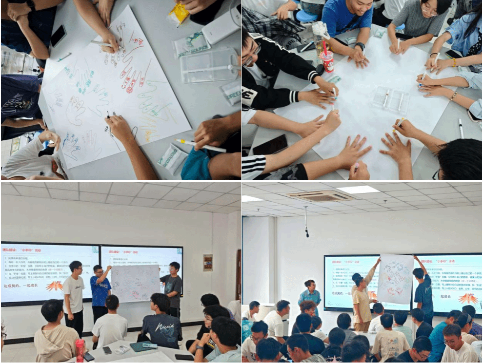在“小手印”破冰活动环节,新生们郑重地在白纸上留下手印,各小组通力合作,围绕手印展开艺术创作。现场气氛热烈,同学们在欢声笑语中迅速增进了解,凝聚集体认同,一幅幅承载梦想与承诺的画卷徐徐展开。