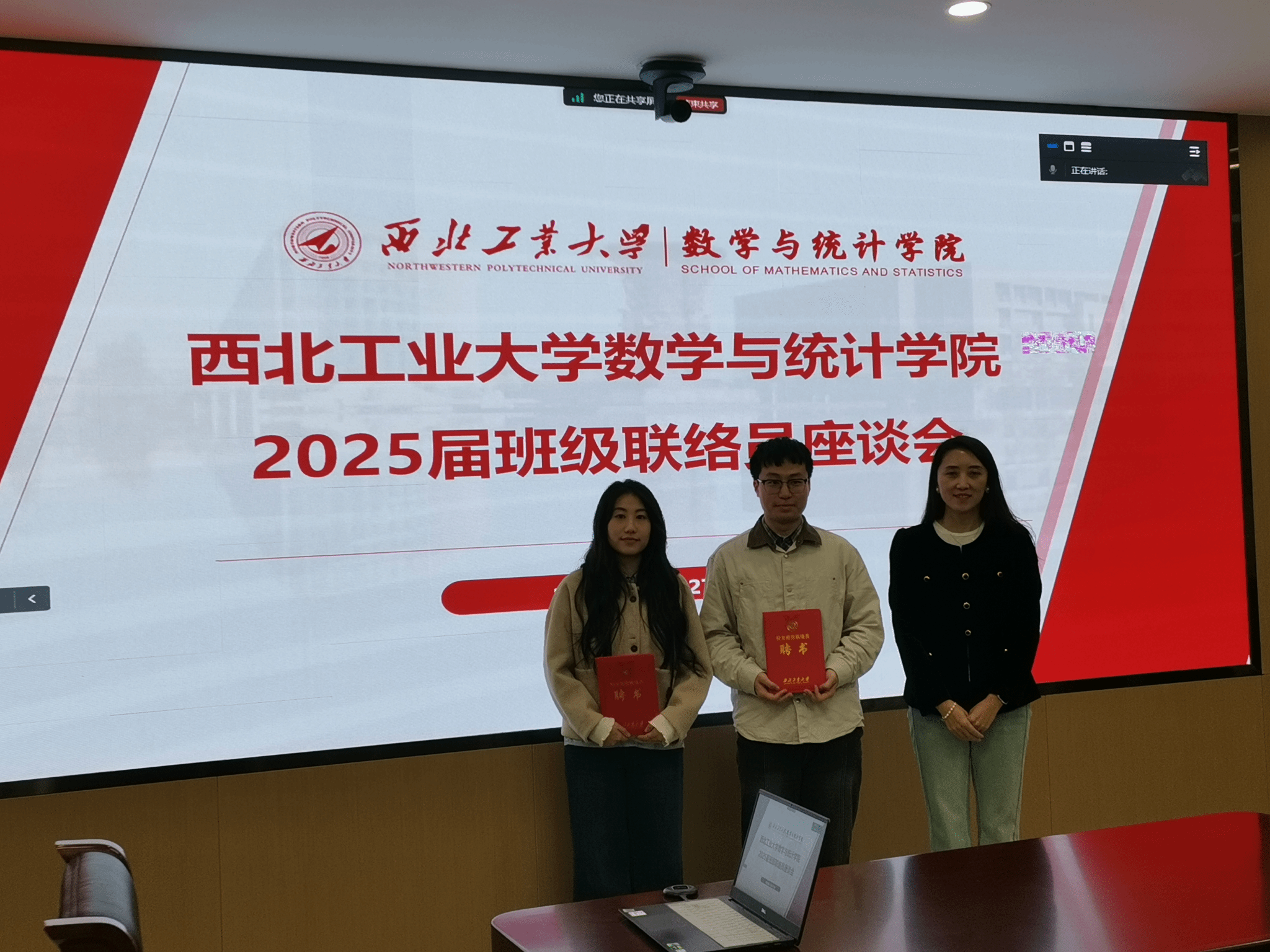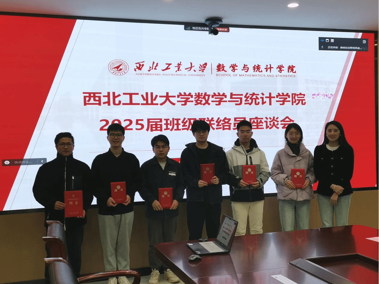 会议第三项,2025届校友班级联络员代表进行了发言。2025届研究生张睿浓首先表达了对学校以及学院的感谢,通过回忆课堂、组会以及学院生活学习的点点滴滴,深刻体会到了“数理为基,应用为翼”的人才培养理念。未来,她也将继续以“西工大人”的身份自勉,做基础研究时不忘“厚德求真”的院训,面对技术攻关时发扬“隐姓埋名、为国铸剑”的传统,在平凡岗位上践行“把论文写在祖国大地上”的嘱托,搭建好校友与母校之间的桥梁,让情谊历久弥新。2025届本科生朱智祥从入学谈起,到满怀热忱即将奔赴祖国各地,从课堂的师生互动,到奋斗实践中的“工大烙印”,再到感恩师友的相伴温暖,正是因为这些瞬间,才有了更好的自己。未来,他也将继续进一步深造,始终铭记校风校训,以《九章算术》的智慧破解时代命题,以《梦溪笔谈》的胸怀拥抱科技创新,励志作永远在路上的追梦人。此外,学院还邀请了2024届校友班级联络员徐纳川同学分享,他从班级联络员的职责、价值以及怎么做出发,从自身实践入手,鼓励新一届班级联络员成为终身的“班干部”、坚实的“传声筒”以及凝聚力量的“万磁王”,为新一届班级联络员明晰了方向,也为更好地开展后续校友工作打下了坚实基础。