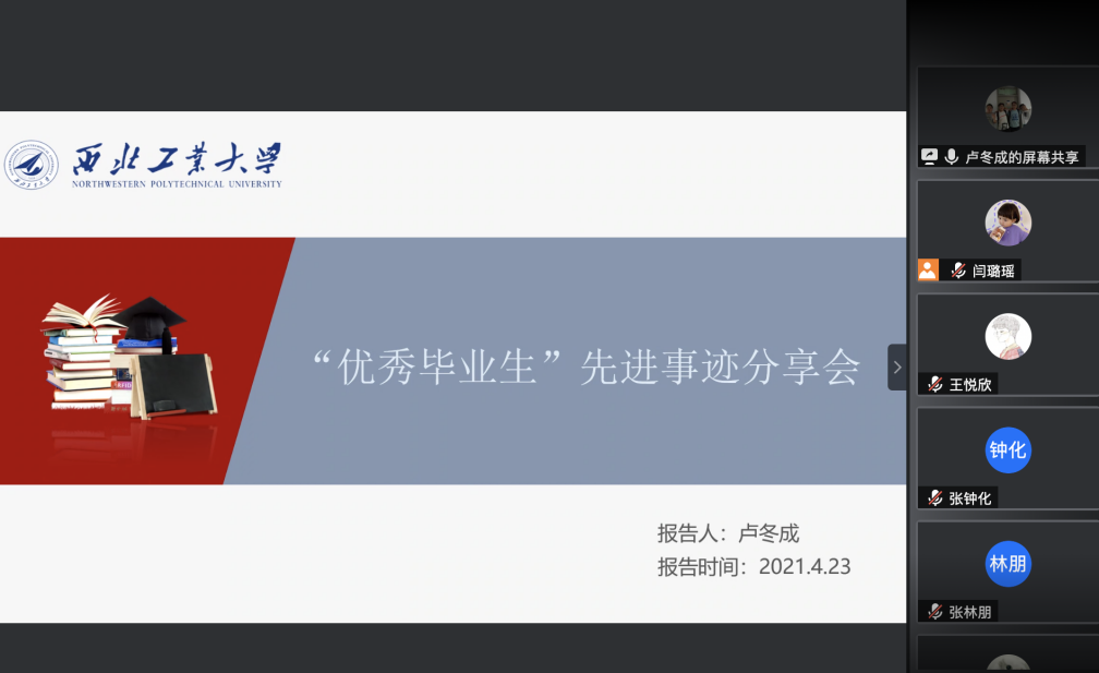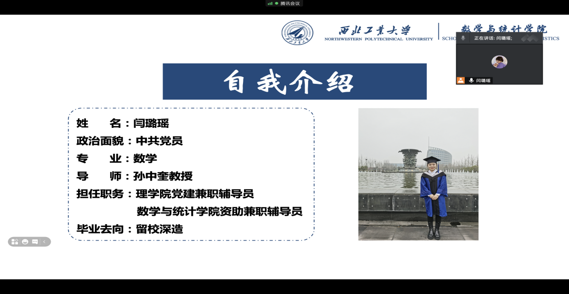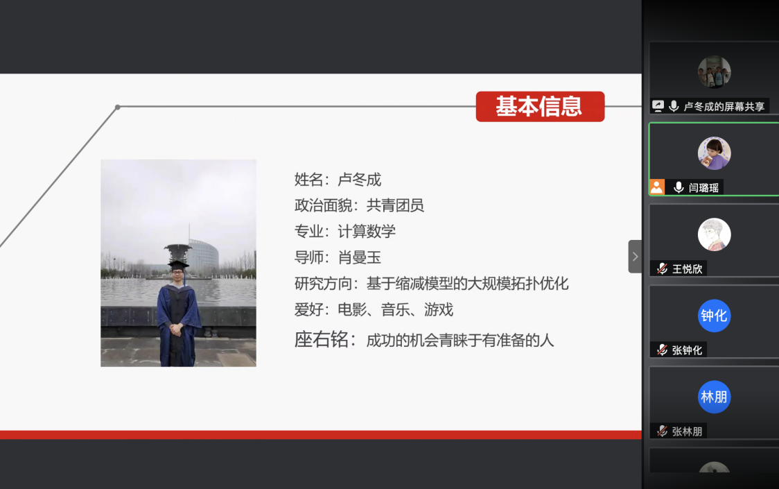 2021年4月23日,数学与统计学院举行了2021届研究生优秀毕业生线上分享会,2021届优秀毕业生闫璐瑶、张林朋和卢冬成三位毕业生围绕他们在校期间的生活、科研、工作等方面,为学弟学妹们分享经验。