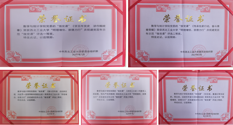 日前,在西北工业大学“明理增信、崇德力行”庆祝建党百年示范“微党课”活动公布的评审结果中,数学与统计学院党委选送的五个作品均榜上有名,全部获奖。其中由学院党委副书记(主持工作)王莉同志讲述的微党课《学百年党史 讲巾帼故事》在101个获奖作品中拔得头筹,位列第一。其余作品《传承先辈行动,奋斗青春荣耀》《奋斗百年路 启航新征程 向世界一流高等教育强国迈进》《讲西工大老一代数学人故事,悟共产党员精神》《忆往昔,重温红军长征史;再出发,迈进百年奋斗目标新征途》分获两个二等奖、两个三等奖共计四项殊荣。