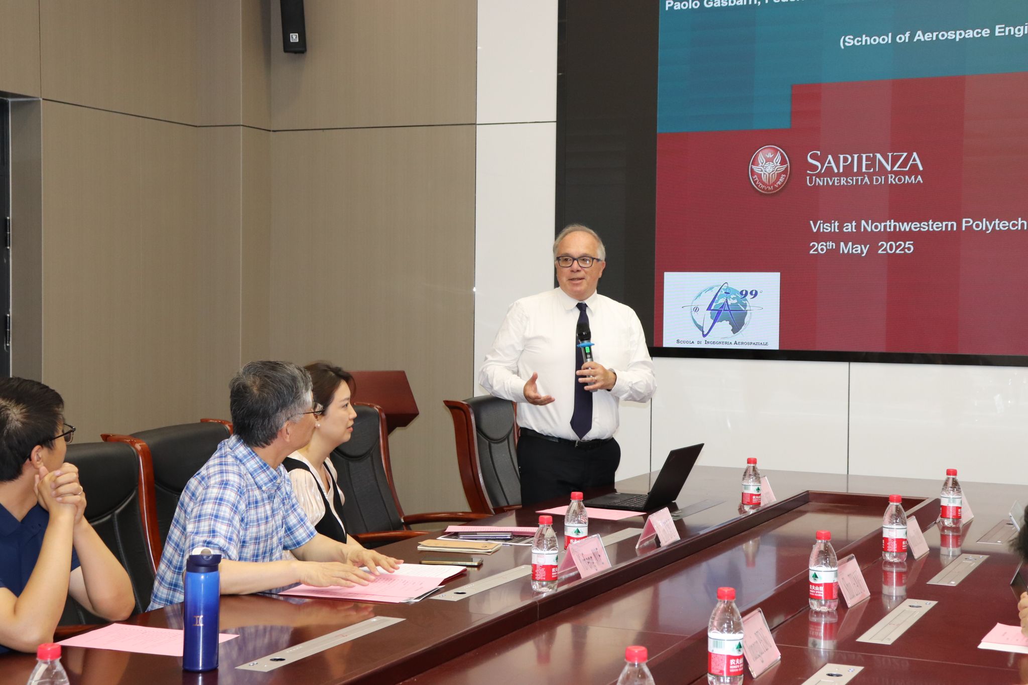 之后,肖曼玉教授介绍了我院相关情况。双方就本科生海外毕业设计、硕博联合培养暑期国际学堂等合作事项展开深入探讨。聂玉峰院长代表学院向 Paolo Gasbarri 教授颁发了“九章荣誉教授” 聘书,表达了对此次合作的高度重视。聂院长期待以此次合作为起点,推动两校在航天数学建模、复杂系统分析等领域的联合攻关,共同探索学术前沿,培养具有国际视野的高素质人才。