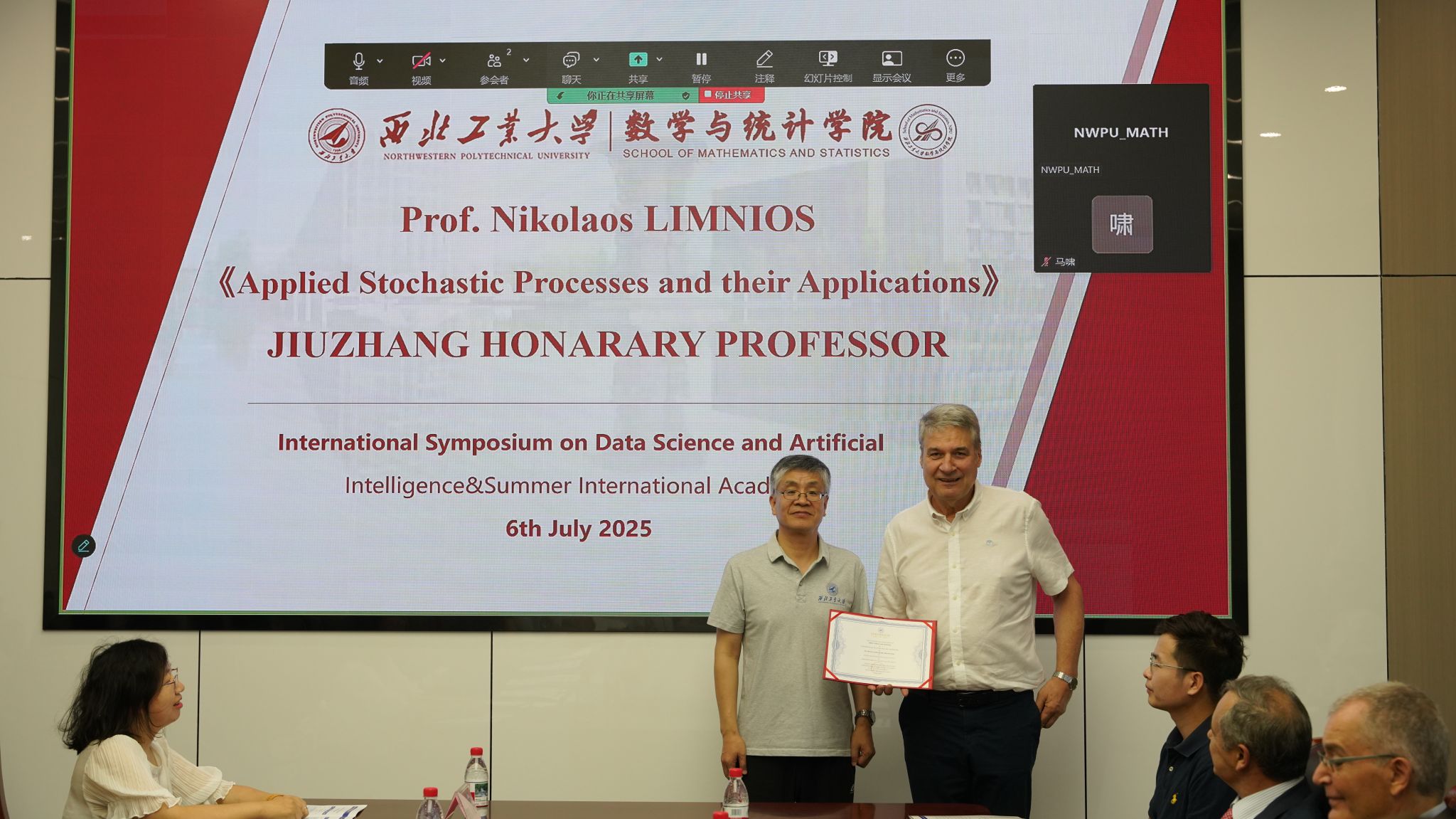 会议开幕式由数学与统计学院副院长都琳教授主持,学院院长聂玉峰教授致开幕辞。聂院长向与会学者表示热烈欢迎,对参与报告的专家颁发九章学术荣誉证书并与外籍专家合影留念。