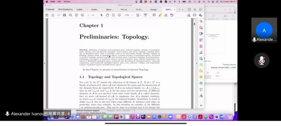 本课程的主题是“超空间几何-Hausdorff距离几何”。Alexander O. Ivanov教授介绍了一般拓扑学的基础知识,包含拓扑空间、开闭集、拓扑的基和子基、连续映射、同胚、嵌入、序列的收敛、闭包、稠密子集、可分性、Hausdorff空间、连通空间、道路连通空间、紧空间和序列紧空间等等。Alexander O. Ivanov教授通过绘图等多种生动形象的形式授课,使同学们透彻理解每个概念。