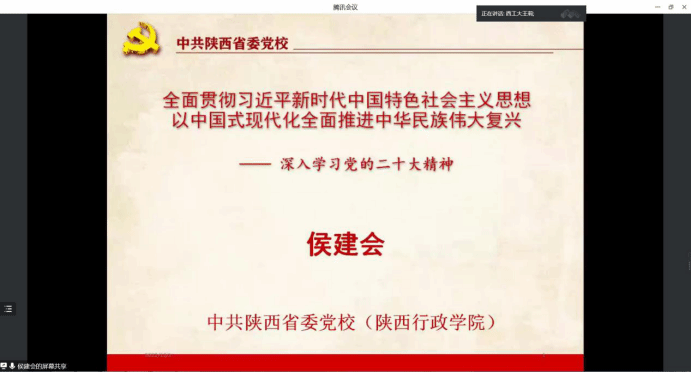 12月1日,数学与统计学院邀请中共陕西省委党校(陕西行政学院)侯建会教授作党的二十大精神专题辅导报告。辅导报告通过线上视频的方式开展,学院党委书记王莉主持,学院领导班子成员、教职工党员、学生党员代表共计100余人参加本次报告会。