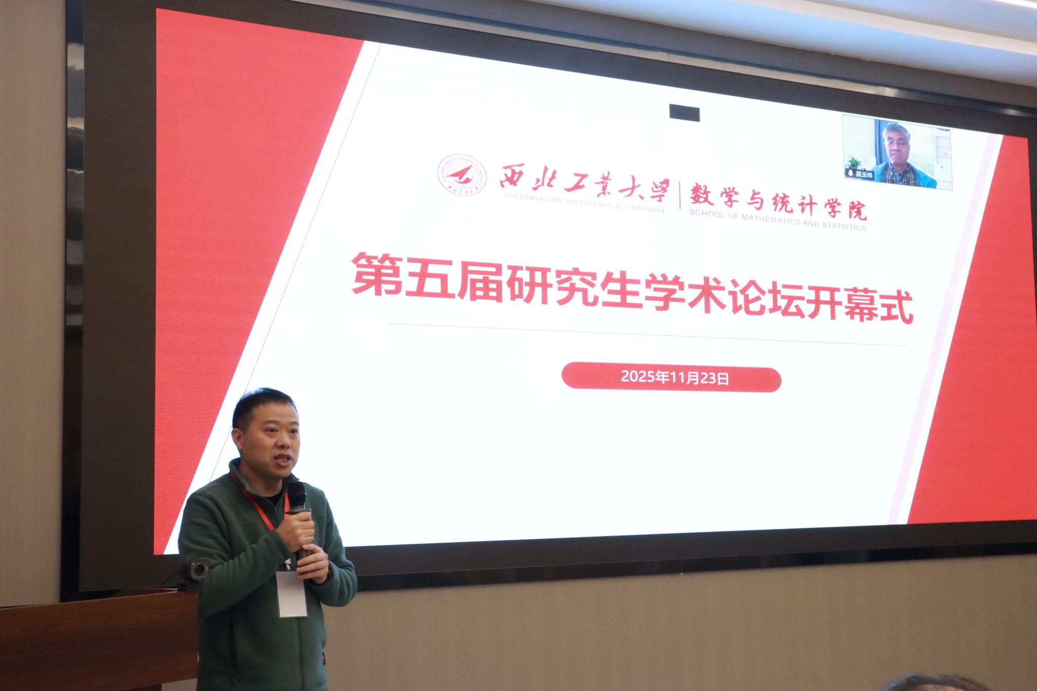 2025年11月23日,西北工业大学数学与统计学院在长安校区成功举办第五届研究生学术论坛。数学与统计学院院长聂玉峰、研究生院副院长刘准钆、数学与统计学院副院长徐根玖、论坛负责人王俊刚、多位教师代表、各年级研究生,以及来自同济大学、重庆大学、西安交通大学、西北大学等高校的博士生共120余人出席了本次论坛。论坛开幕式由徐根玖主持。