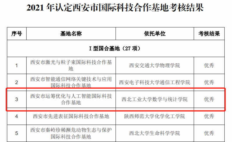 日前,西安市科学技术局(外国专家局)发布了《关于 2021年认定西安市国际科技合作基地考核结果的通知》。经过评审、考察和公示等环节,我院西安市运筹优化与人工智能国际科技合作基地考核结果优秀,参与考核的27个I 型国合基地中共有11个考核结果优秀。