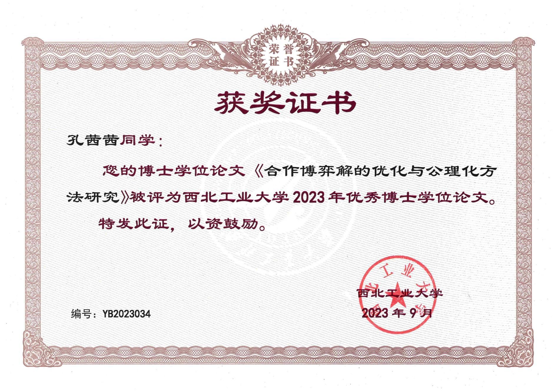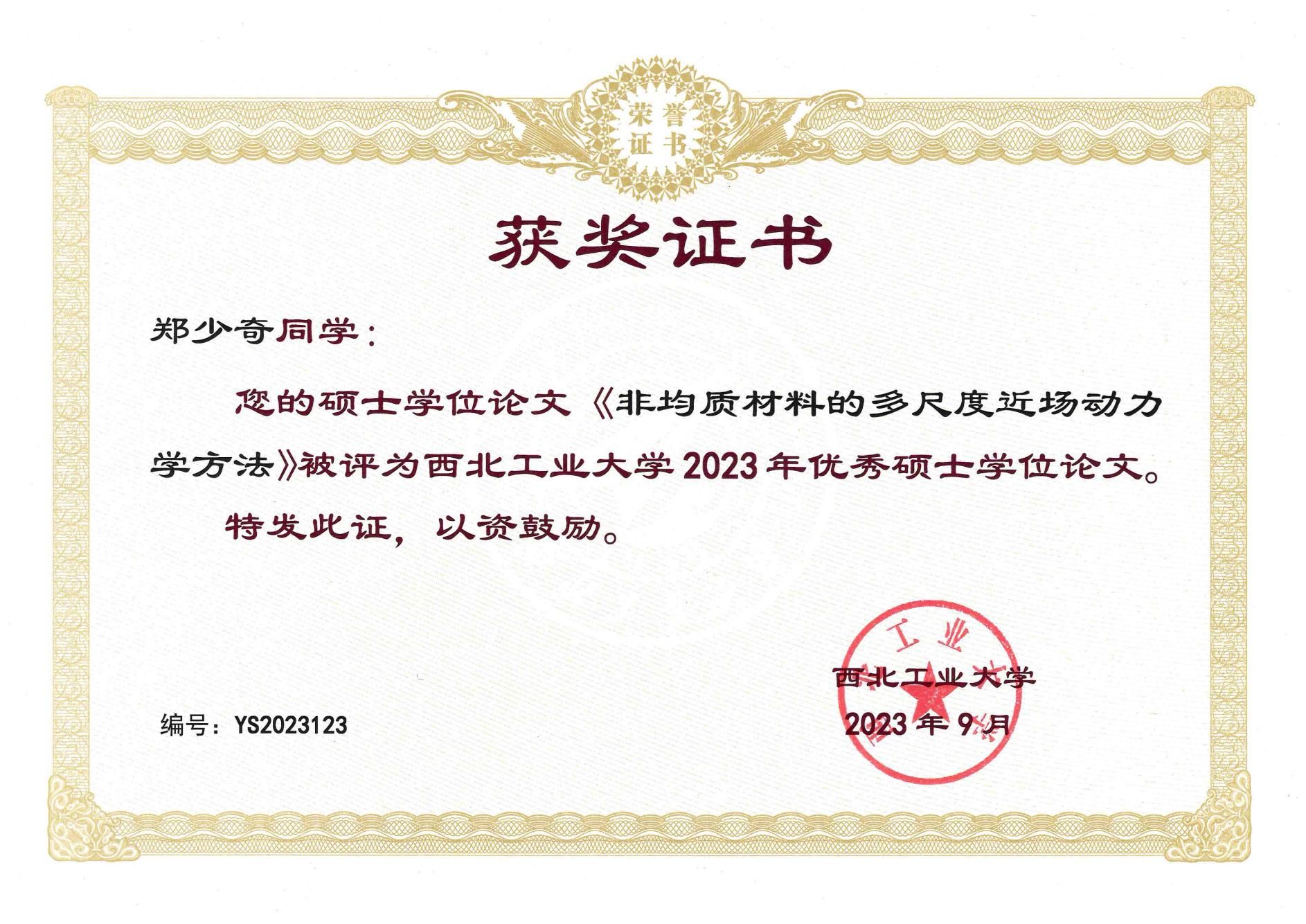 近日,学校公布了《关于公布2023年西北工业大学优秀博士、硕士学位论文评选结果的通知》,对获得优秀博士、硕士学位论文的学生及导师进行了表彰。我院研究生培养工作再结硕果,共入选优秀博士学位论文2篇、优秀硕士学位论文2篇。