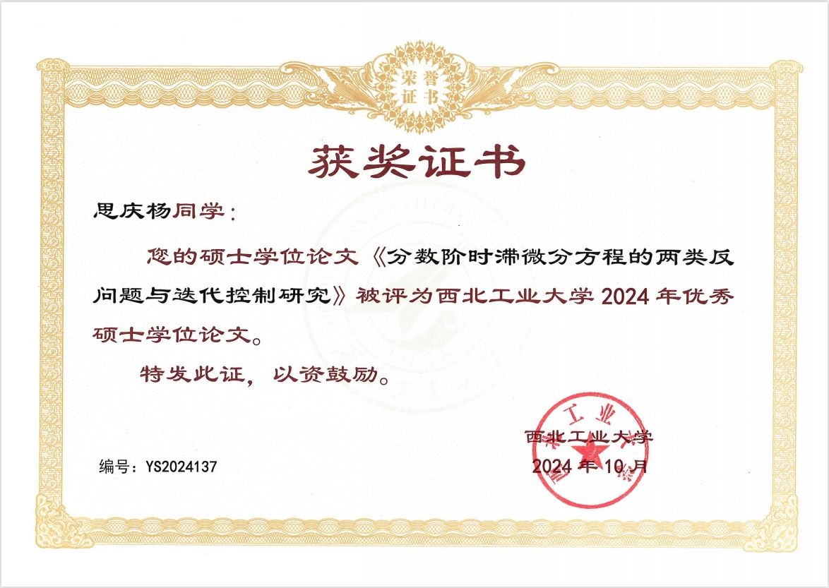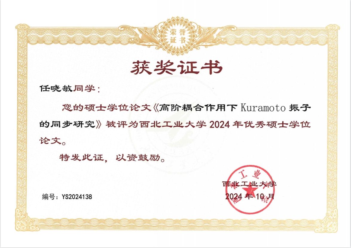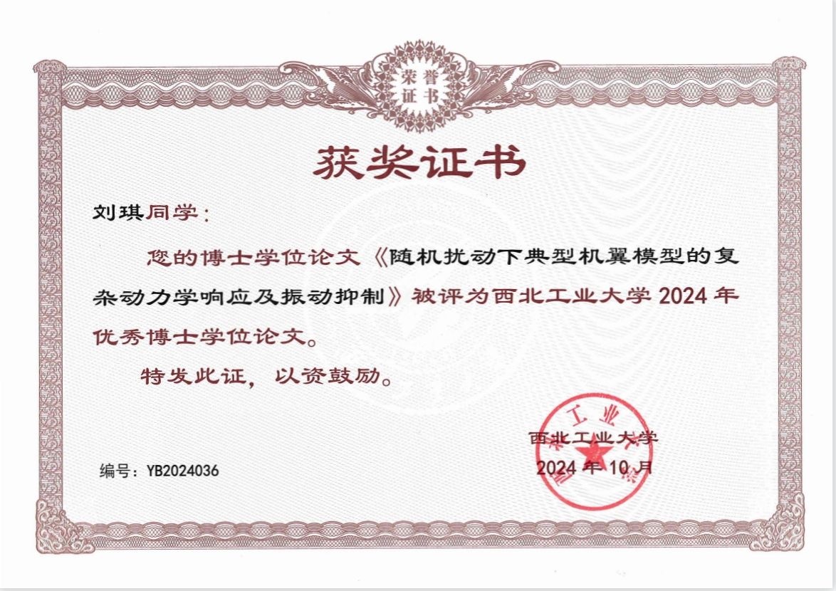 近日,学校公布了《关于公布2024年西北工业大学优秀博士、硕士学位论文评选结果的通知》,对获得优秀博士、硕士学位论文的学生及导师进行了表彰。我院研究生培养工作再结硕果,共入选优秀博士学位论文2篇、优秀硕士学位论文3篇。