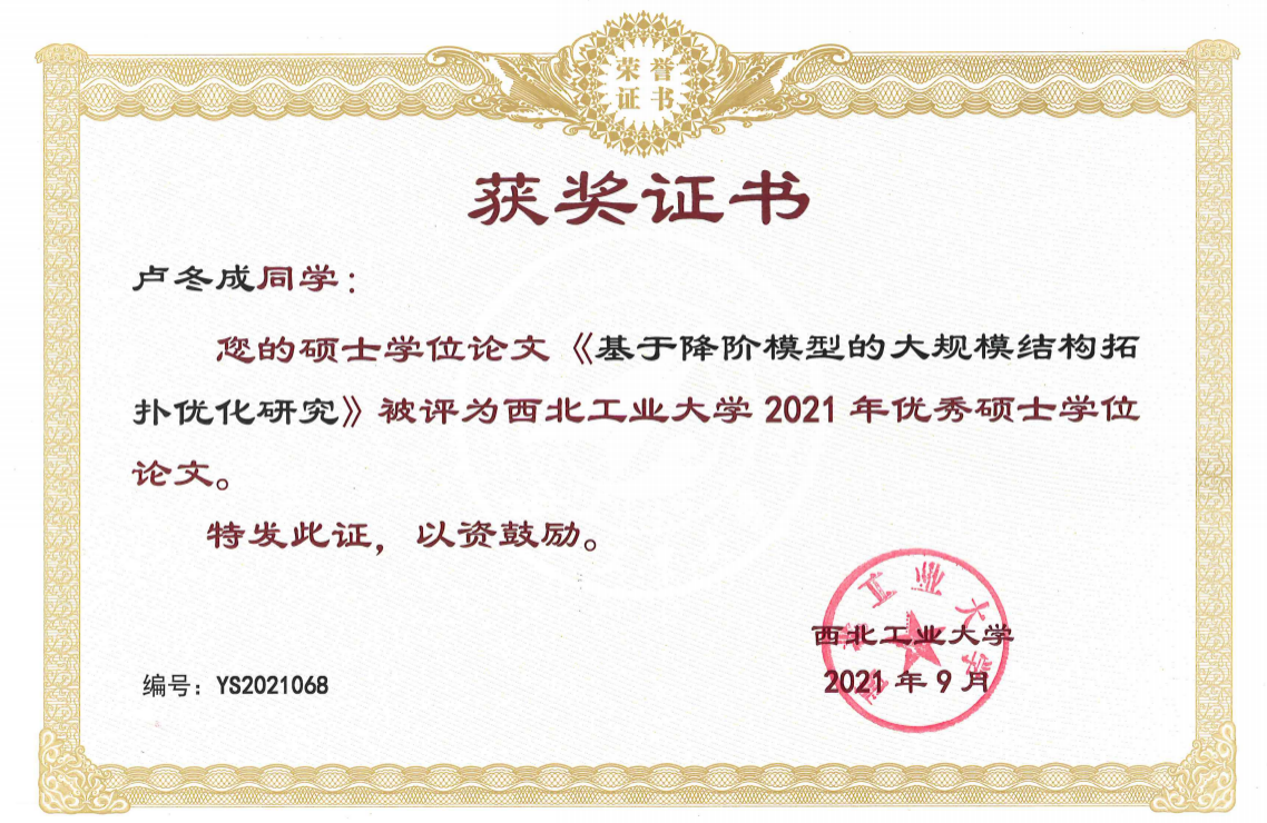 个人简介:卢冬成,男,计算数学专业,师从肖曼玉副教授,研究方向为基于缩减模型的大规模结构拓扑优化,致力于解决拓扑优化设计自由度大、效率低的重难点问题。硕士学习期间,参与国家自然科学基金、中央高校基金、省基金等多个项目,主持并完成韩国av 研究生创意创新种子基金项目1项,积极参与多项重大基金和项目以及国内外学术会议,共发表3篇高水平学术论文,为大规模拓扑优化的学术研究和工程应用提供了一定参考价值。荣获硕士研究生国家奖学金等多个奖项,并荣获2021年优秀毕业生称号。