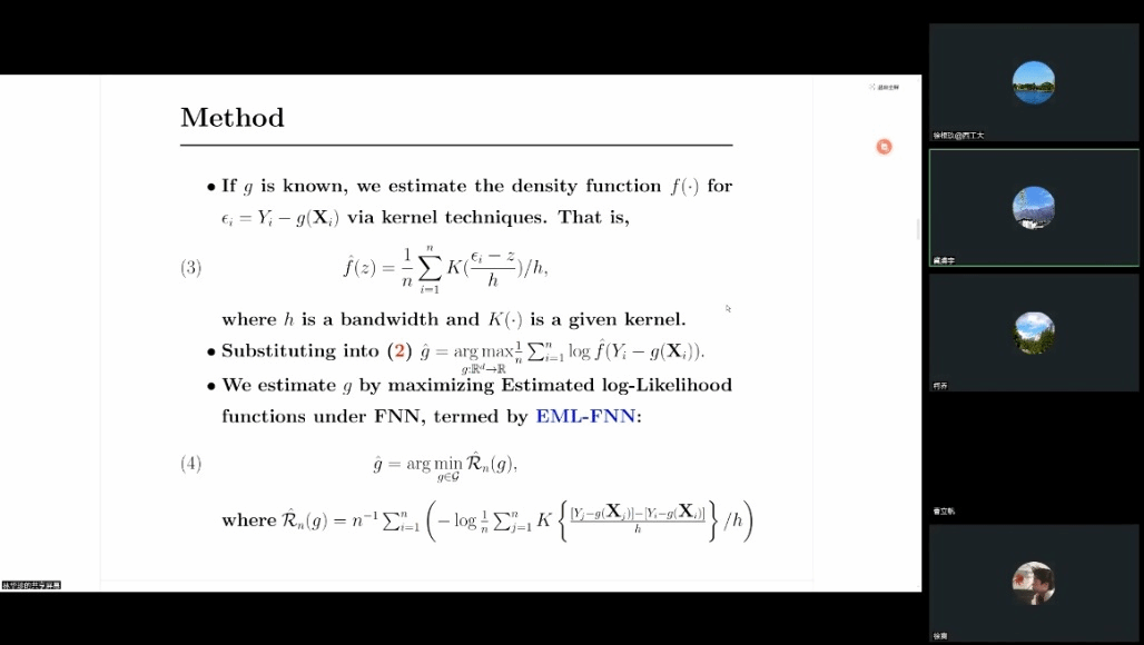 林华珍首先介绍了深度回归学习中研究最优损失函数的动机。随后,她详细阐述了如何通过核函数自适应地从数据中学习潜在的误差分布,通过最大似然框架获得最优的损失函数,以及该方法的理论性质。林华珍凭借其深厚的学术造诣,将复杂的理论问题抽丝剥茧,讲解既有理论深度,又紧密联系实际,使在场的师生对深度回归学习有了更全面、深入的了解。