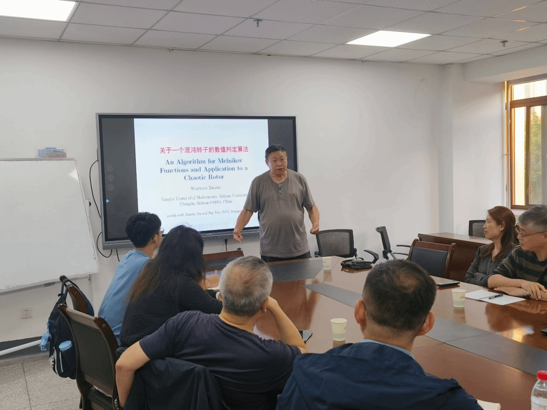 2023年10月31日,第二期“九章数学学术讲堂”在勇字楼701会议室进行,讲堂邀请四川大学张伟年教授作题为“一个混沌转子的数值判定算法”的学术报告。数学与统计学院院长聂玉峰、副院长都琳,以及徐伟、许勇教授等20余位师生参会,报告由许勇主持。