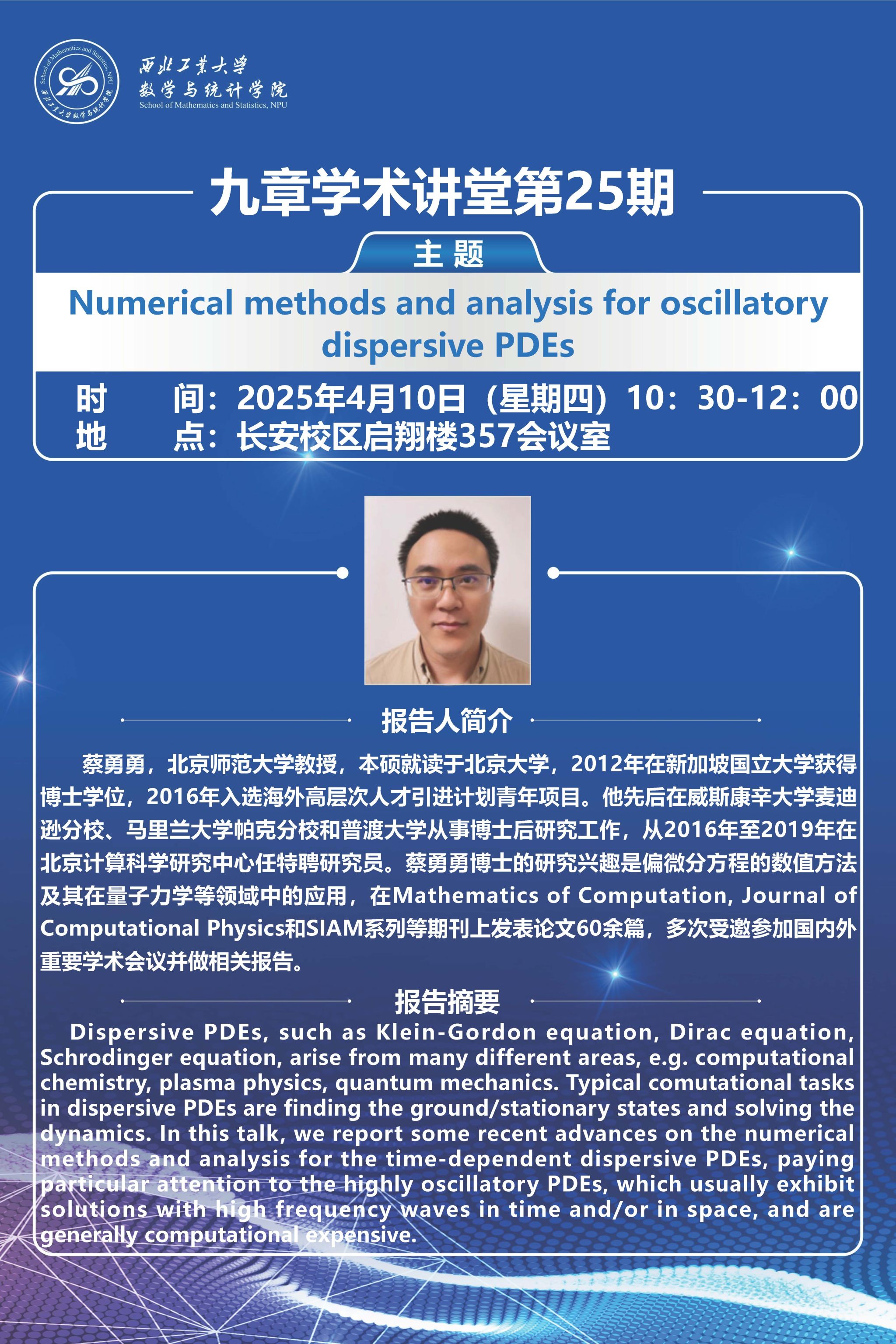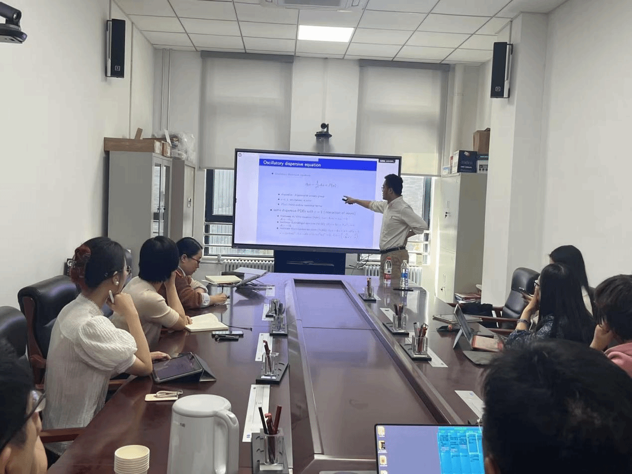 蔡勇勇以《Numerical methods and analysis for oscillatory dispersive PDEs 》为题,从一般的色散偏微分方程出发,介绍了此类方程的基态/稳态求解和动力学模拟。重点探讨了色散型偏微分方程数值方法与分析的最新进展,特别指出了具有时空高频振荡特性的方程——这类问题通常表现为解函数在时间和/或空间维度上的高频波动,其数值模拟往往需要极高的计算成本。