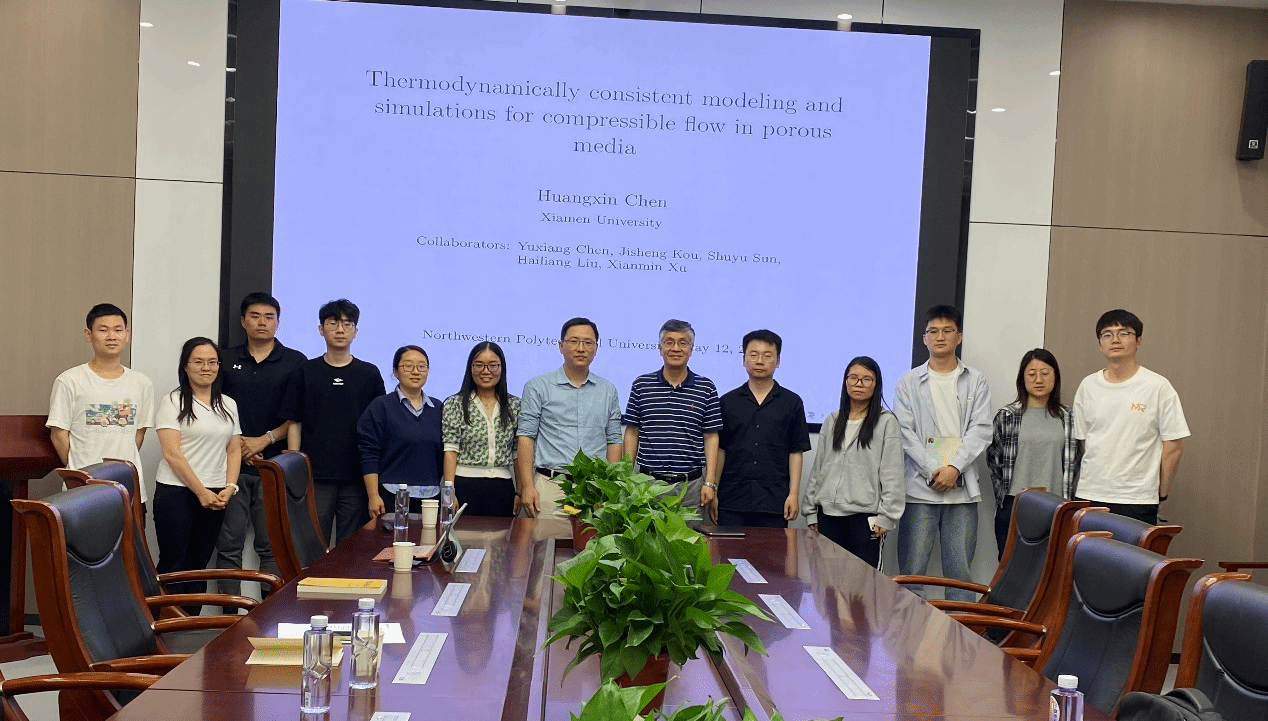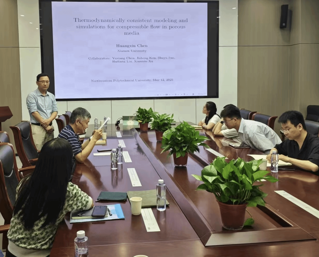2025年5月12日,数学与统计学院邀请厦门大学陈黄鑫教授做客“九章学术讲堂”第30期,为我校师生作了题为《Thermodynamically consistent modeling and simulations for compressible flow in porous media》的精彩学术报告。报告在长安校区海天苑大楼E103会议室举行,数学与统计学院聂玉峰教授、杨宗泽教授等近30名师生参加了报告会,报告会由聂玉峰主持。