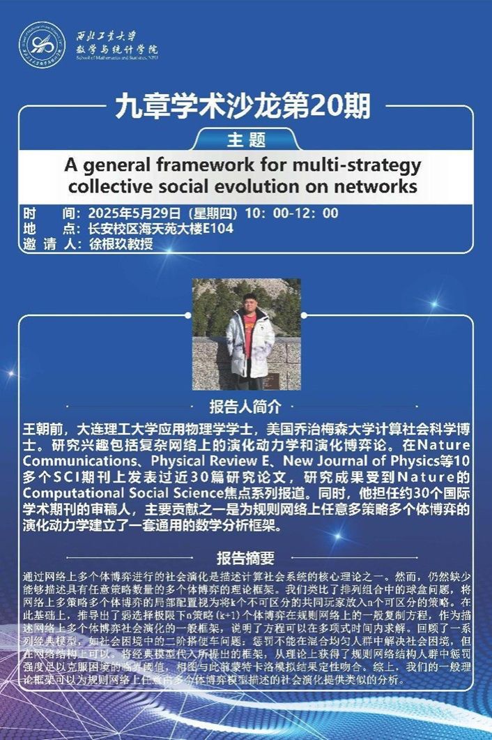 5月29日,美国乔治梅森大学(George Mason University)计算社会科学博士王朝前到访数学与统计学院,为我院师生带来题为《A general framework for multi-strategy collective social evolution on networks》的学术分享。学院20余位师生参会,会议由副院长徐根玖教授主持。