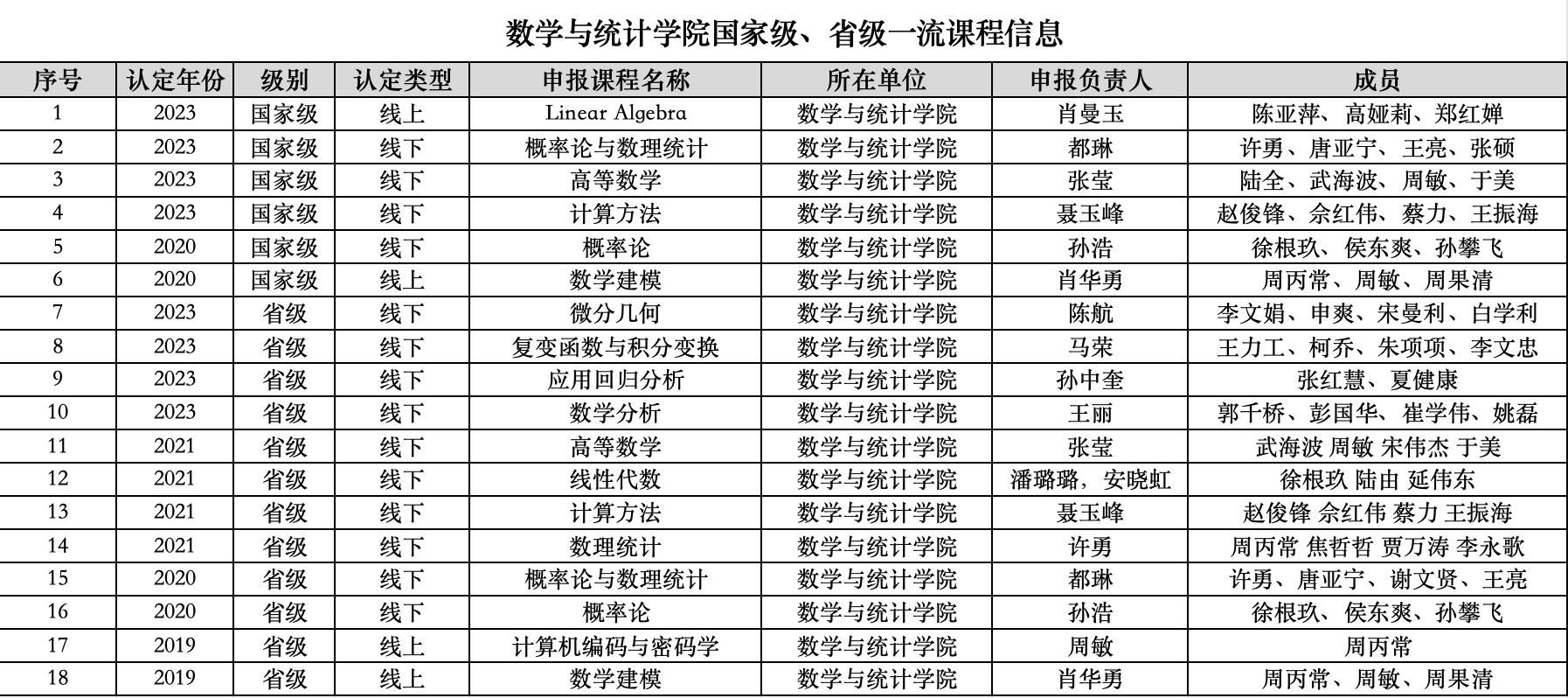 近年来,数学与统计学院积极响应教育部一流本科课程建设“双万计划”,深化教育教学改革,加强课程建设,立足社会发展需求和人才培养目标,以学生为中心,形成学校特色、具有示范引领作用的一流本科课程体系,旨在构建更高水平人才培养体系,并应用课程建设新理念、新模式,加强一流本科课程建设与应用,提升本科课程的高阶性、创新性和挑战度。