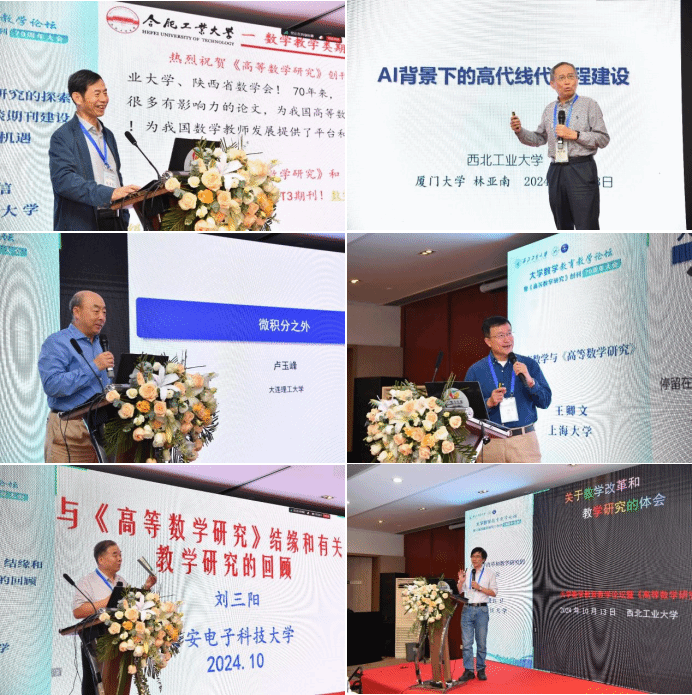 合肥工业大学朱士信教授以《大学数学教学研究的探索与实践——兼谈期刊建设的挑战和机遇》为题、厦门大学林亚南教授以《AI背景下的高代线代课程建设的一些思考》为题、大连理工大学卢玉峰教授以《微积分之外》为题、上海大学王卿文教授以《教育数学与<高等数学研究>》为题、西安电子科技大学刘三阳教授以《与<高等数学研究>结缘和有关教学研究经历的回顾》为题、复旦大学楼红卫教授以《关于教学改革和教学研究的体会》为题分别做了精彩报告,为我校数学教育教学提供了宝贵经验。电子科技大学黄廷祝教授、哈尔滨工业大学吴勃英教授、厦门大学谭忠教授、华北理工大学刘春凤教授、西安交通大学李继成教授、西北工业大学聂玉峰教授分别担任报告主持。最后,聂玉峰进行了总结发言,他向所有在《高等数学研究》刊登论文的作者,向所有编委、审稿专家和编辑部人员,致以崇高的敬意和诚挚的感谢!