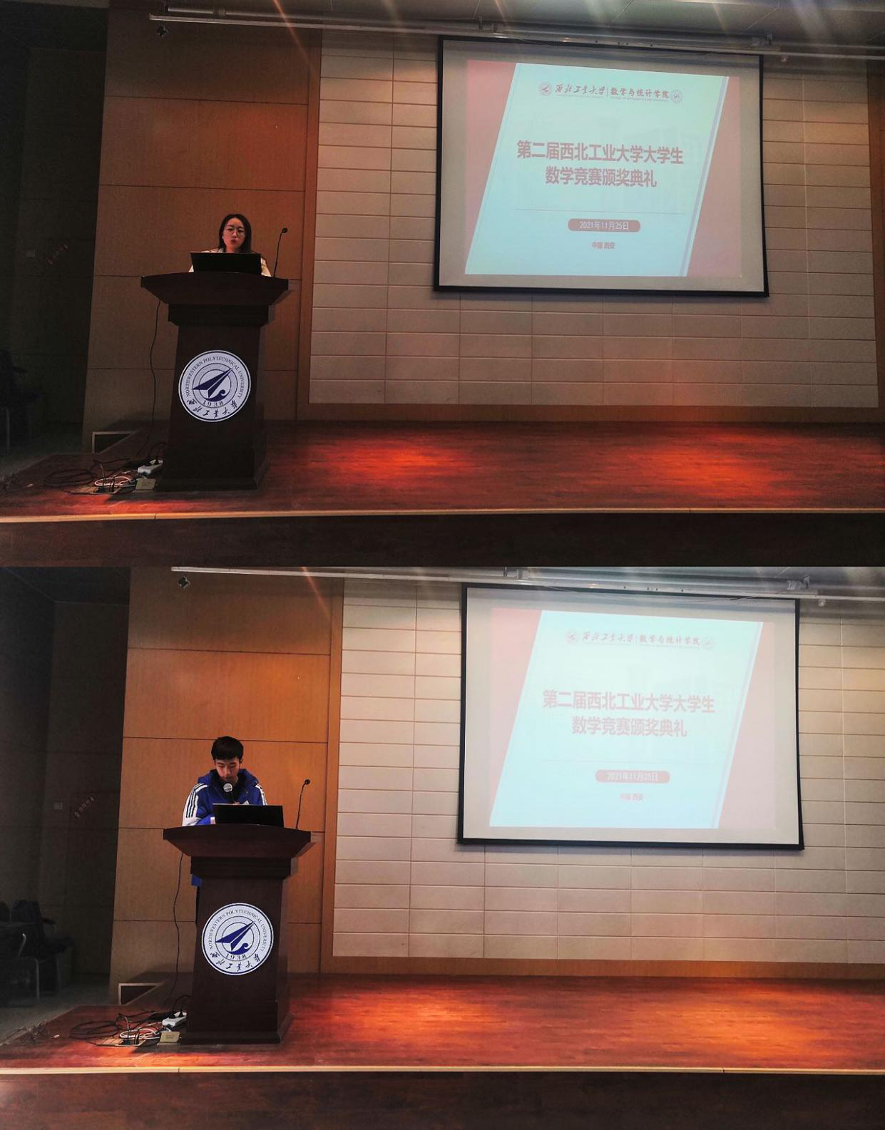 为营造良好的数学氛围,激发学生学习数学的兴趣,展示数学基础和思维能力,推进我校拔尖人才的培养,由教务处主办、数学与统计学院承办的第二届西北工业大学大学生数学竞赛于2021年10月23日上午成功举办。为表彰在本次数学竞赛中获奖的学生,2021年11月25日,数学与统计学院在理学院学术报告厅举办了颁奖典礼。院长聂玉峰、党委书记王莉、副院长都琳、院长助理刘晓刚、竞赛负责人马荣老师、教学秘书原姗、常昕烨及获奖学生等百余位师生出席了本次颁奖典礼。典礼由都琳主持。