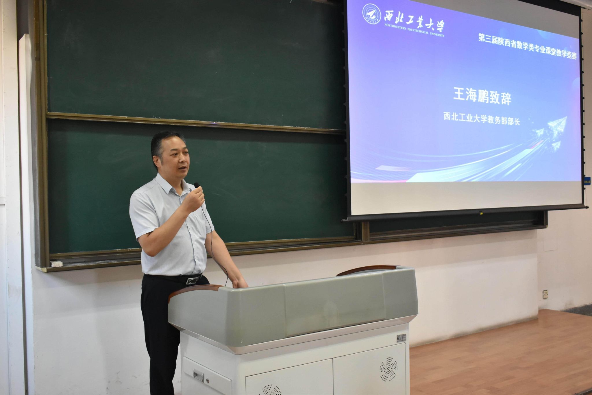 西北工业大学教务部部长王海鹏在开幕式上致辞,代表学校对莅临指导的各位评审专家表示诚挚欢迎和衷心感谢,并向成功晋级现场决赛的28位参赛教师致以热烈祝贺。