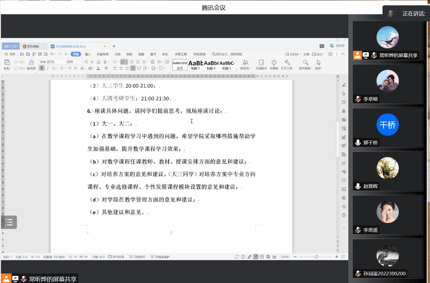 为贯彻落实一流本科人才培养行动计划,提高立德树人质量,2023年1月6日,数学与统计学院召开期末本科生线上座谈会。数学与统计学院教学副院长郭千桥,院长助理刘晓刚,教学秘书常昕烨、李思遥、李卓榕,及本科四个年级的学生代表参加了本次会议。