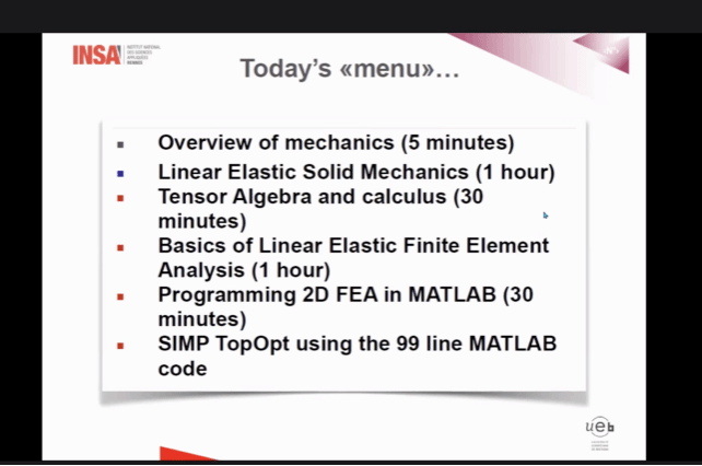 Balaji Raghavan教授注重学生编程实践能力的培养,如对于结构拓扑优化方法,着重讲了结构优化设计的基本思想,并结合99行Matlab代码进行基于SIMP方法的二维结构拓扑优化问题的编程实现演练,包括结构离散、单元节点编号、荷载及边界条件的施加、拓扑优化迭代求解、不同输入参数对拓扑结构的影响等。另外还介绍了对于动载荷下的拓扑优化编程实现方法,以及相应的实时动态缩减拓扑优化方法。