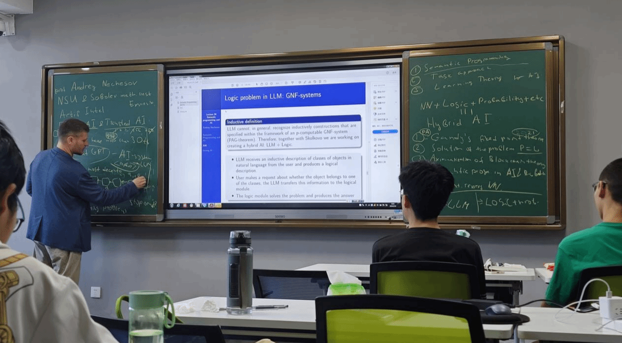 本次课程吸引了数学与统计学院的本科生与研究生参加或旁听,主讲老师为俄罗斯科学院索伯列夫数学研究所研究员Andrey Nechesov,研究领域包括数学逻辑、人工智能解释算法理论、数字孪生体、语义编程等。