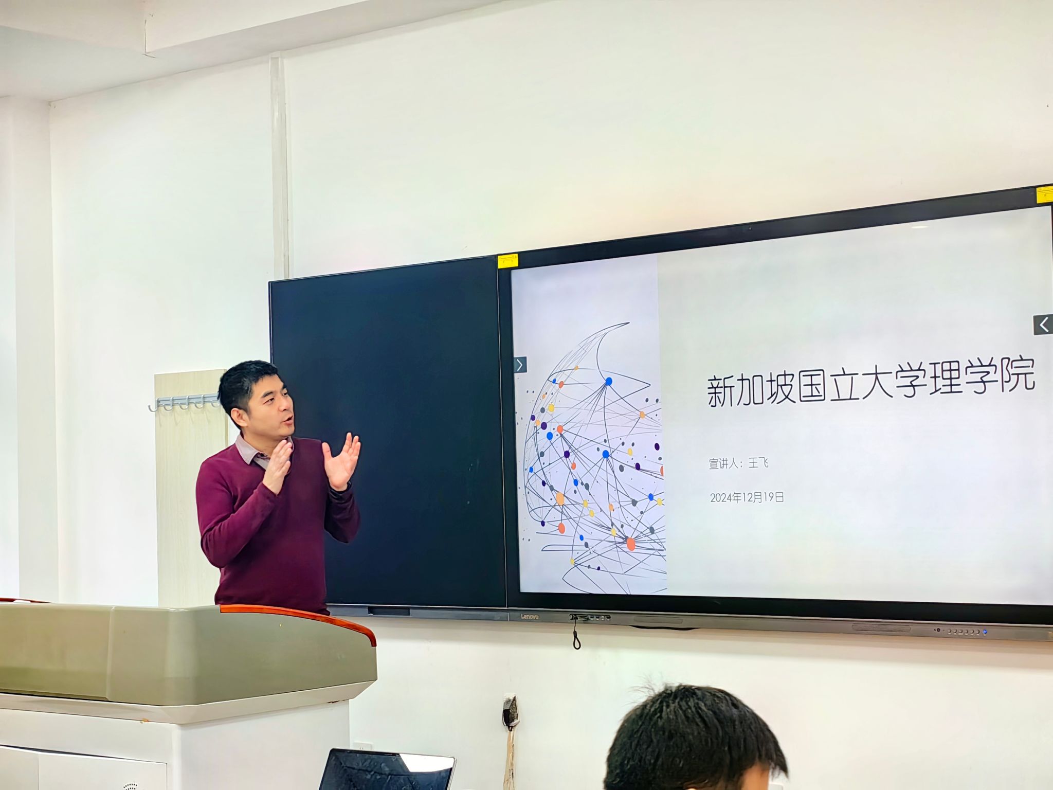 随后,王飞教授详细介绍了新加坡国立大学的概况、教育模式、硕博生招生流程,以及理学院的学科背景和学术发展。同学们积极提问,就专业方向选择和出国留学事宜进行了深入交流。王飞教授耐心解答,并鼓励同学们在本科阶段打下坚实的基础,积极探索未来的学术与职业道路。