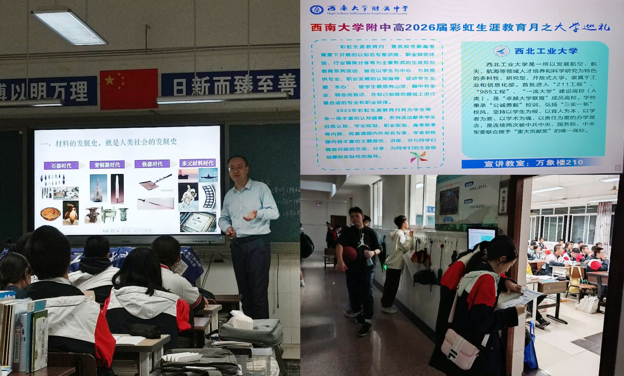 11月10日,应西南大学附中邀请,材料学院王永欣副院长、数学与统计学院重庆招生组王振海老师前往重庆市西大附中参加高2026届彩虹生涯教育月大学巡礼活动并开展科普讲座等招生宣传工作。