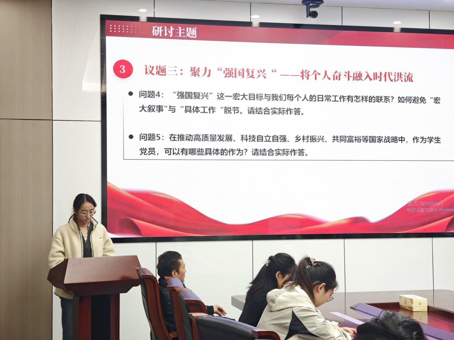 在集中学习环节,硕士生第九党支部书记赵祎璠带领全体党员回顾了第二次集中大课内容,回顾了新时代中国共产党的奋斗目标与历史使命,号召青年党员坚定理想信念,筑牢思想根基。
