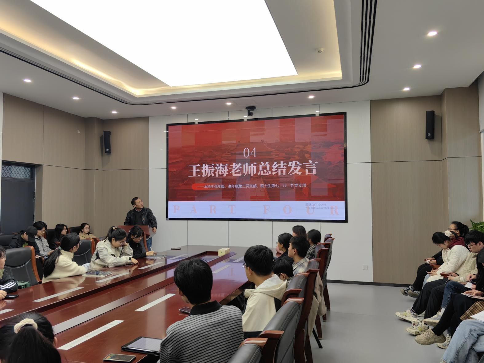 最后,王振海老师进行了总结发言。他充分肯定了活动组织与讨论成效,鼓励党员同志将学习成果转化为实际行动,在科研学习、社会实践等方面主动作为,努力成为有理想、有本领、有担当的新时代青年。